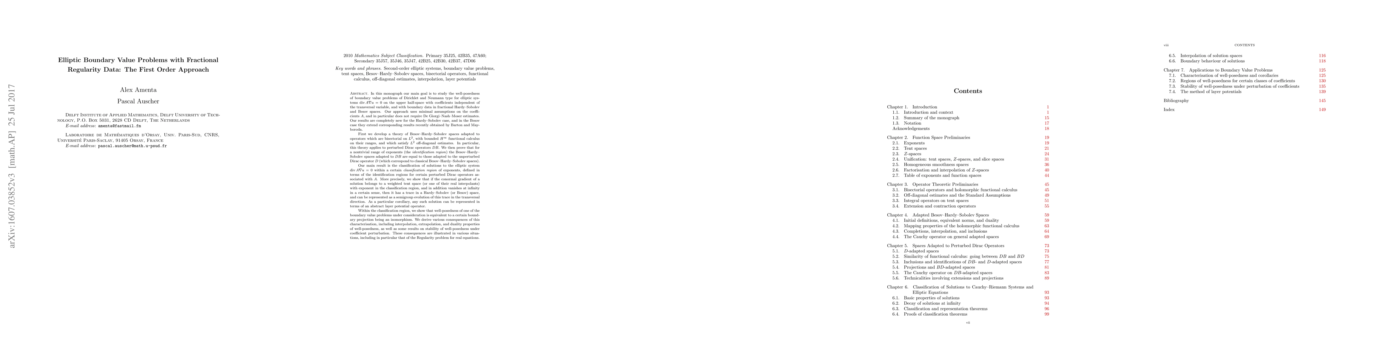 This paper investigates the well-posedness of elliptic boundary value problems with fractional regularity data in fractional Besov-Hardy-Sobolev spaces. It introduces a first-order approach that avoids De Giorgi-Nash-Moser estimates and classifies solutions of elliptic systems within a specific range of exponents, demonstrating their representation through layer potential operators and abstract semigroup evolutions.