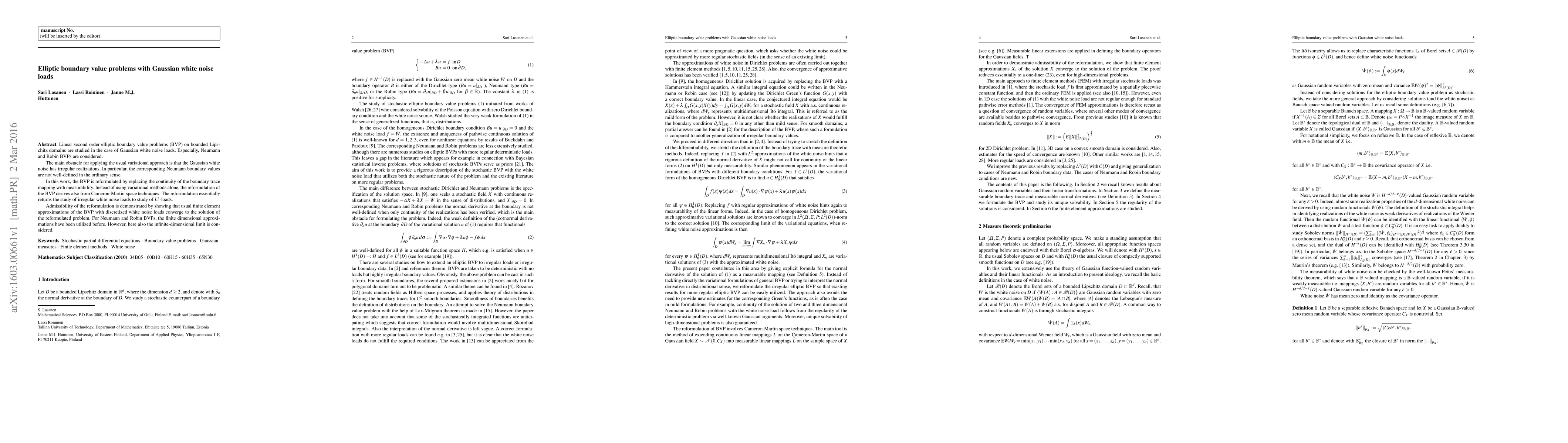 This paper studies linear second-order elliptic boundary value problems with Gaussian white noise loads, reformulating the problem to handle irregular realizations by replacing continuity with measurability and using Cameron-Martin space techniques. The reformulation's validity is demonstrated through convergence of finite element approximations to the solution of the reformulated problem.