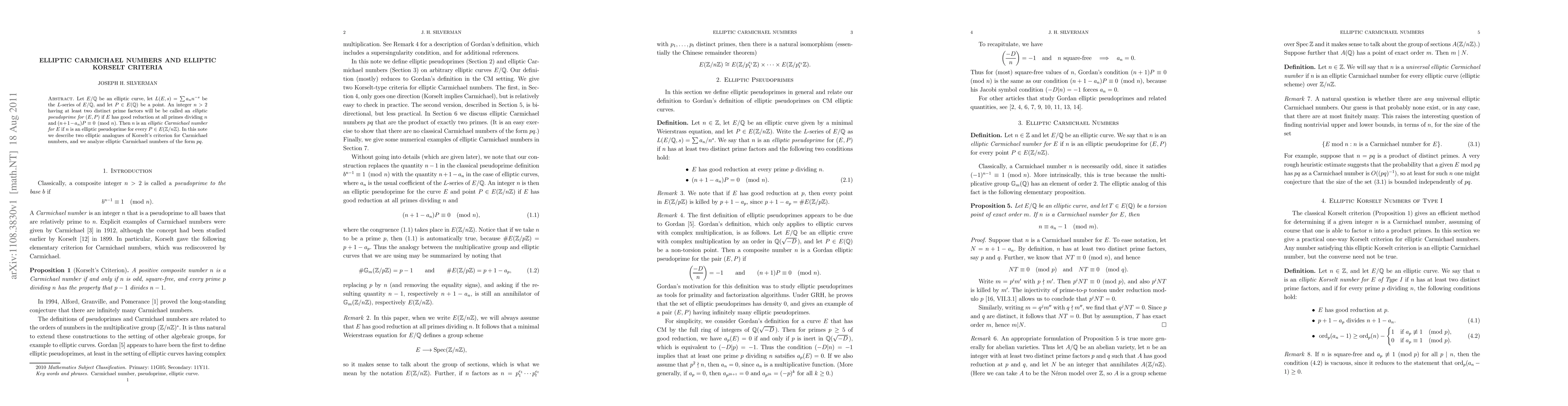 Let E/Q be an elliptic curve, let L(E,s)=\sum a_n/n^s be the L-series of E/Q, and let P be a point in E(Q). An integer n > 2 having at least two distinct prime factors will be be called an elliptic pseudoprime for (E,P) if E has good reduction at all primes dividing n and (n+1-a_n)P = 0 (mod n). Then n is an elliptic Carmichael number for E if n is an elliptic pseudoprime for every P in E(Z/nZ). In this note we describe two elliptic analogues of Korselt's criterion for Carmichael numbers, and we analyze elliptic Carmichael numbers of the form pq.
