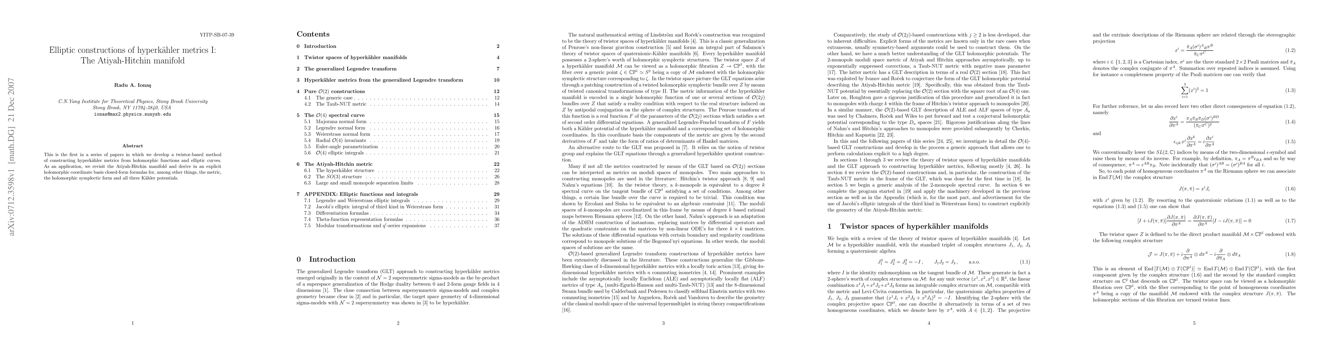 This is the first in a series of papers in which we develop a twistor-based method of constructing hyperkaehler metrics from holomorphic functions and elliptic curves. As an application, we revisit the Atiyah-Hitchin manifold and derive in an explicit holomorphic coordinate basis closed-form formulas for, among other things, the metric, the holomorphic symplectic form and all three Kaehler potentials.