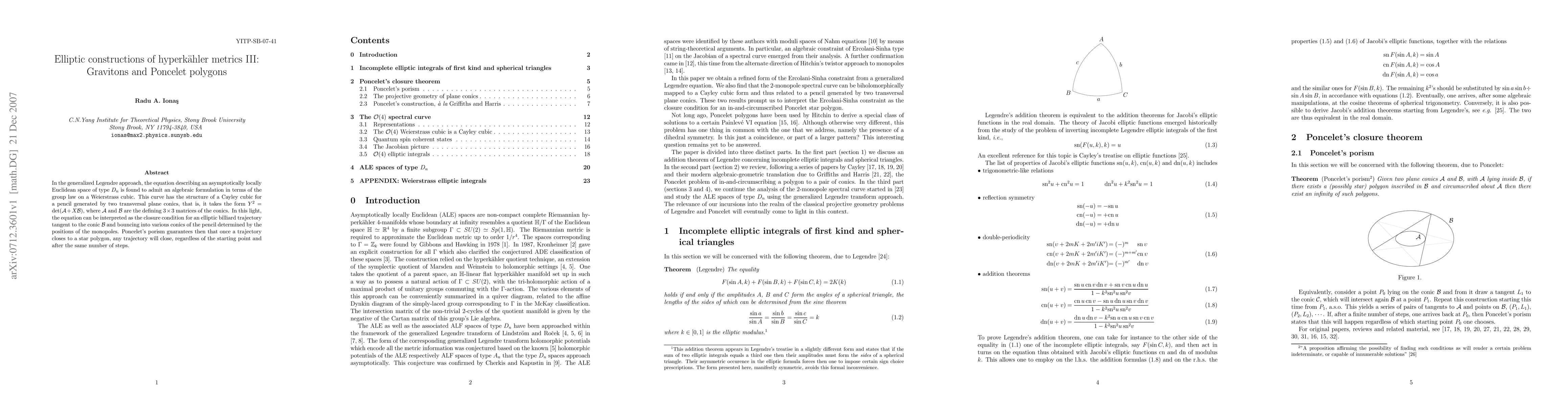 The paper presents an algebraic formulation of the equation for asymptotically locally Euclidean spaces of type $D_n$ using Weierstrass cubics and establishes a connection between gravitons and Poncelet polygons, providing a geometric interpretation of monopole positions in hyperkähler metrics.