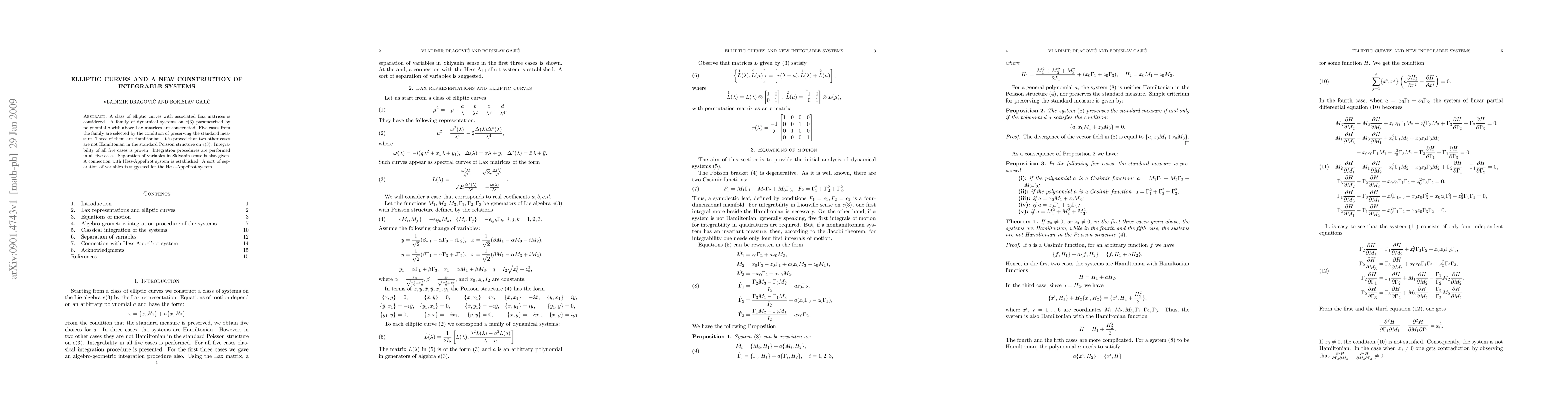 A class of elliptic curves with associated Lax matrices is considered. A family of dynamical systems on e(3) parametrized by polynomial a with above Lax matrices are constructed. Five cases from the family are selected by the condition of preserving the standard mea- sure. Three of them are Hamiltonian. It is proved that two other cases are not Hamiltonian in the standard Poisson structure on e(3). Integra- bility of all five cases is proven. Integration procedures are performed in all five cases. Separation of variables in Sklyanin sense is also given. A connection with Hess-Appel'rot system is established. A sort of sep- aration of variables is suggested for the Hess-Appel'rot system.