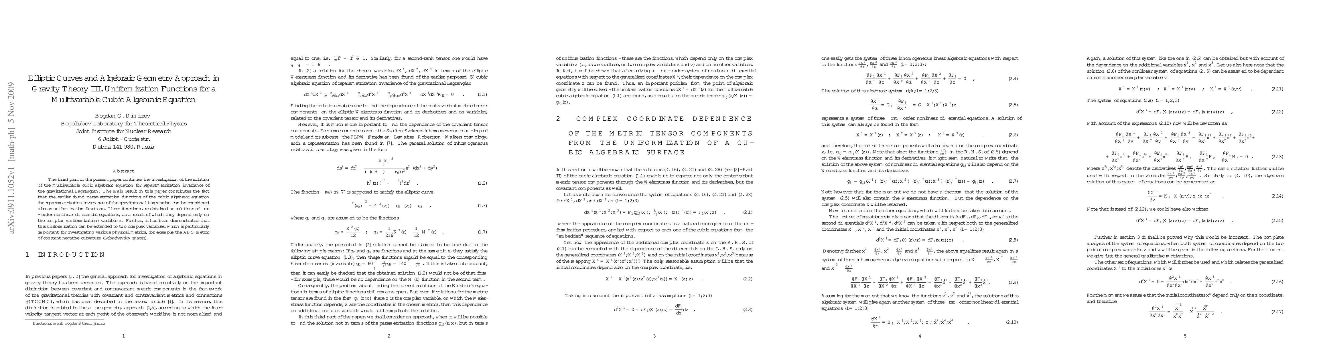 The third part of the present paper continues the investigation of the solution of the multivariable cubic algebraic equation for reparametrization invariance of the gravitational Lagrangian. The main result in this paper constitutes the fact that the earlier found parametrization functions of the cubic algebraic equation for reparametrization invariance of the gravitational Lagrangian can be considered also as uniformization functions. These functions are obtained as solutions of first - order nonlinear differential equations, as a result of which they depend only on the complex (uniformization) variable z. Further, it has been demonstrated that this uniformization can be extended to two complex variables, which is particularly important for investigating various physical metrics, for example the ADS metric of constant negative curvature (Lobachevsky spaces).