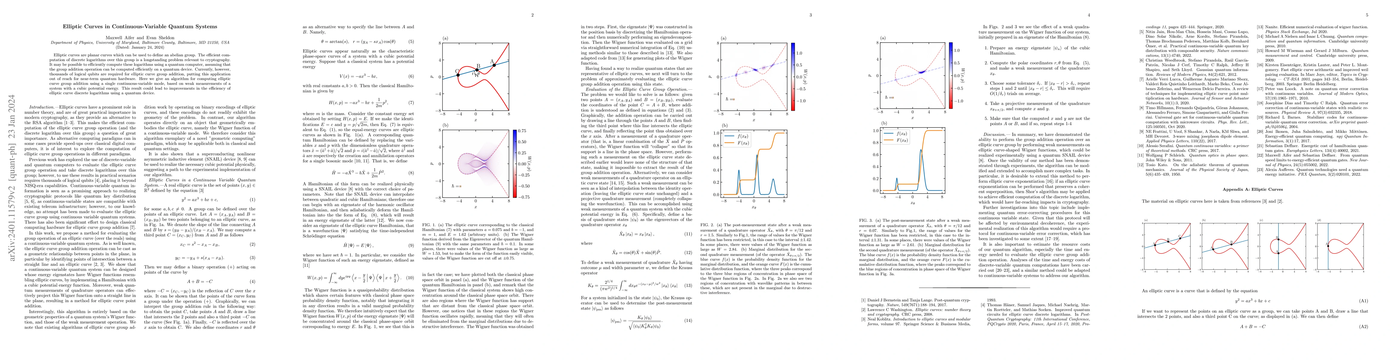 Elliptic curves are planar curves which can be used to define an abelian group. The efficient computation of discrete logarithms over this group is a longstanding problem relevant to cryptography. It may be possible to efficiently compute these logarithms using a quantum computer, assuming that the group addition operation can be computed efficiently on a quantum device. Currently, however, thousands of logical qubits are required for elliptic curve group addition, putting this application out of reach for near-term quantum hardware. Here we give an algorithm for computing elliptic curve group addition using a single continuous-variable mode, based on weak measurements of a system with a cubic potential energy. This result could lead to improvements in the efficiency of elliptic curve discrete logarithms using a quantum device.