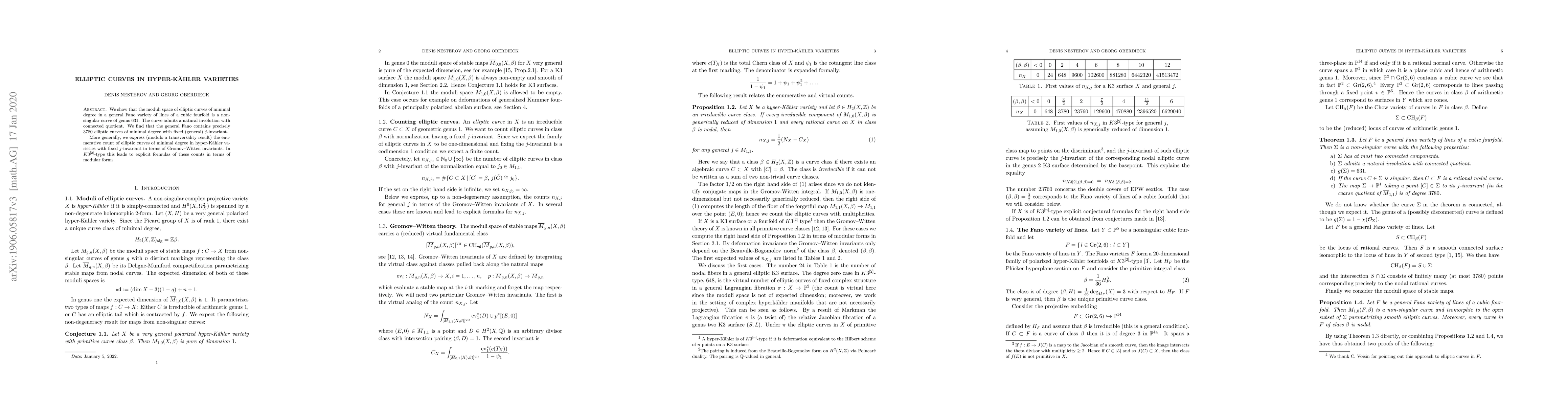 We show that the moduli space of elliptic curves of minimal degree in a general Fano variety of lines of a cubic fourfold is a non-singular curve of genus $631$. The curve admits a natural involution with connected quotient. We find that the general Fano contains precisely $3780$ elliptic curves of minimal degree with fixed (general) $j$-invariant. More generally, we express (modulo a transversality result) the enumerative count of elliptic curves of minimal degree in hyper-K\"ahler varieties with fixed $j$-invariant in terms of Gromov--Witten invariants. In $K3[2]$-type this leads to explicit formulas of these counts in terms of modular forms.