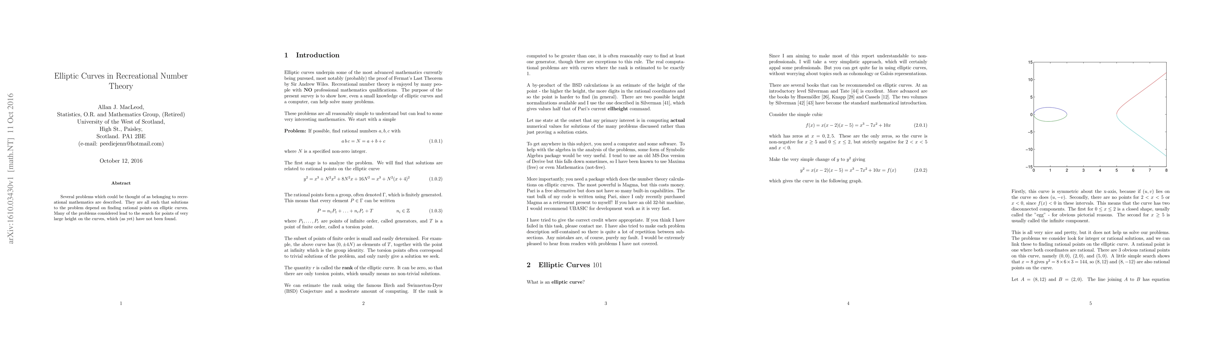 Several problems which could be thought of as belonging to recreational mathematics are described. They are all such that solutions to the problem depend on finding rational points on elliptic curves. Many of the problems considered lead to the search for points of very large height on the curves, which (as yet) have not been found.