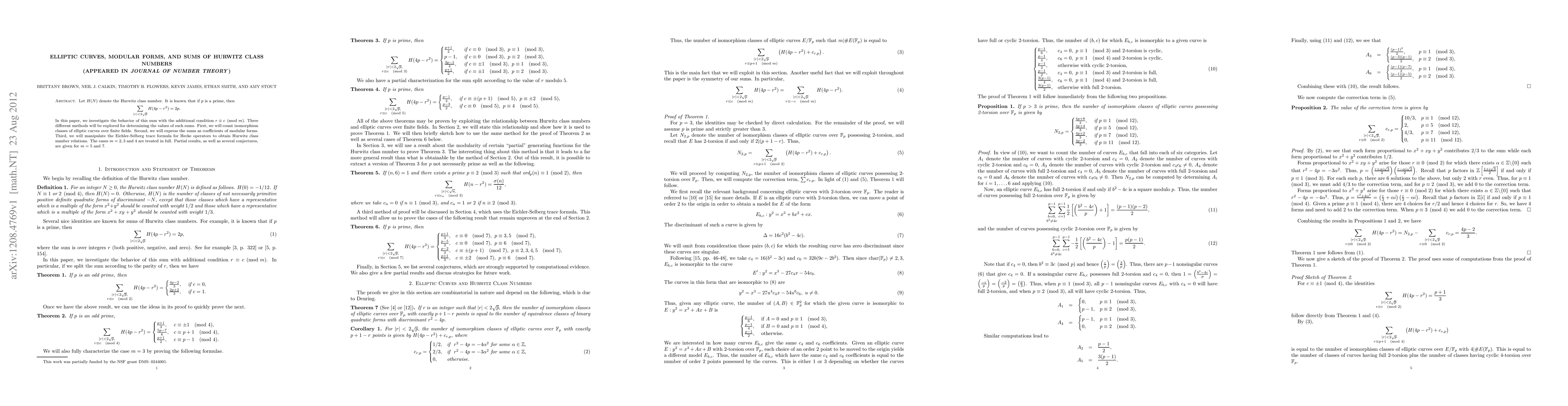 Let H(N) denote the Hurwitz class number. It is known that if $p$ is a prime, then {equation*} \sum_{|r|<2\sqrt p}H(4p-r^2) = 2p. {equation*} In this paper, we investigate the behavior of this sum with the additional condition $r\equiv c\pmod m$. Three different methods will be explored for determining the values of such sums. First, we will count isomorphism classes of elliptic curves over finite fields. Second, we will express the sums as coefficients of modular forms. Third, we will manipulate the Eichler-Selberg trace for ula for Hecke operators to obtain Hurwitz class number relations. The cases $m=2,3$ and 4 are treated in full. Partial results, as well as several conjectures, are given for $m=5$ and 7.