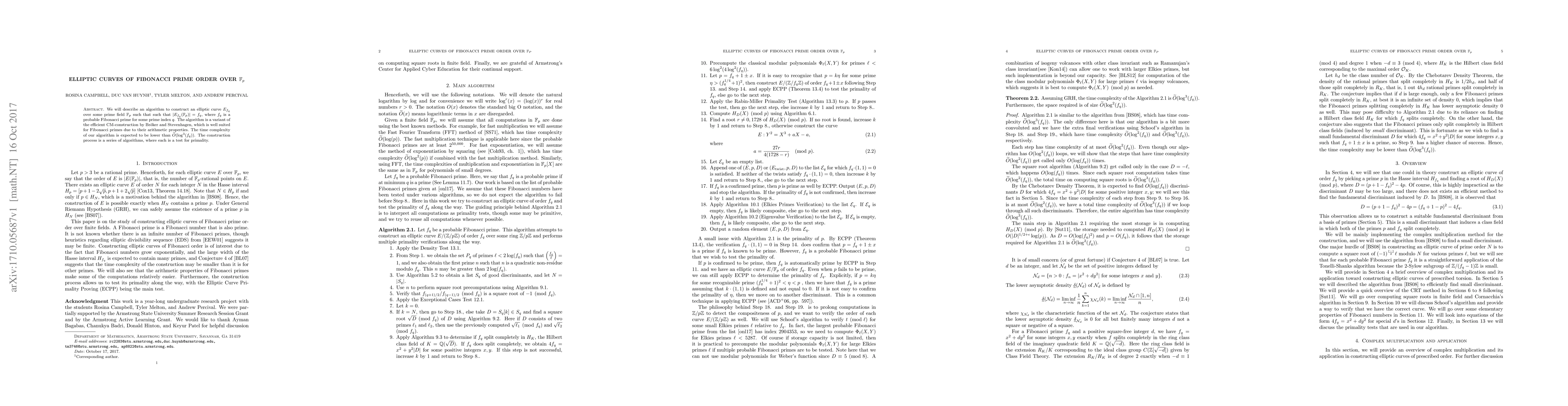 We will describe an algorithm to construct an elliptic curve $E_{f_q}$ over some prime field $\mathbb{F}_p$ such that such that $|E_{f_q}(\mathbb{F}_p)| = f_q$, where $f_q$ is a probable Fibonacci prime for some prime index $q$. The algorithm is a variant of the efficient CM-construction by Br$\ddot{o}$ker and Stevenhagen, which is well suited for Fibonacci primes due to their arithmetic properties. The time complexity of our algorithm is expected to be lower than $\widetilde{O}(\log^3({f_q}))$. The construction process is a series of algorithms, where each is a test for primality.