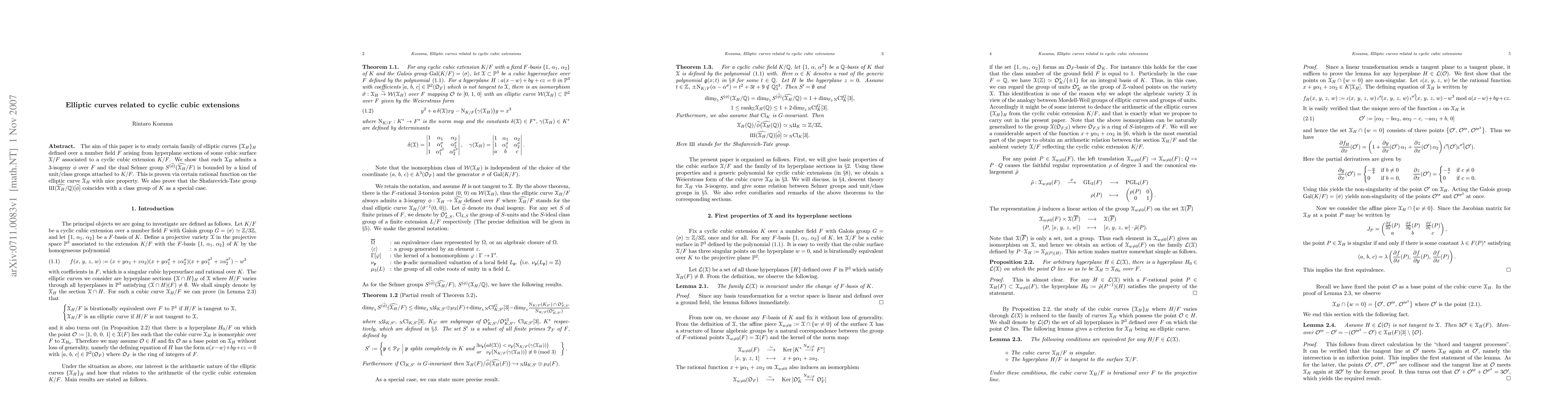 This paper studies a family of elliptic curves derived from cyclic cubic extensions, showing that each curve admits a 3-isogeny with a bounded dual Selmer group related to the extension's unit/class groups. The Shafarevich-Tate group coincides with a class group of the underlying field in a special case.