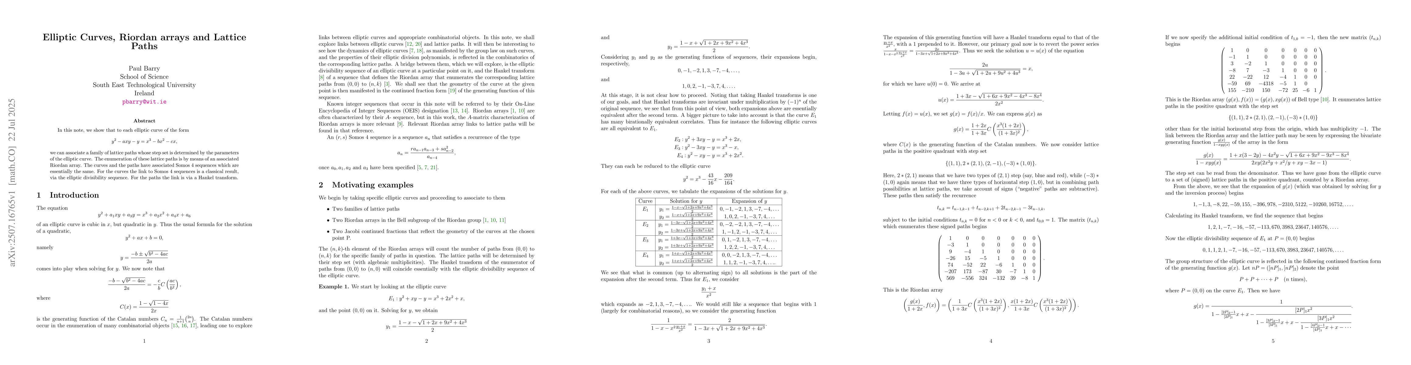 The main technical contribution of this research is the development of a new approach to analyzing the generating function of lattice path enumerators using Riordan array theory and elliptic curve properties.
