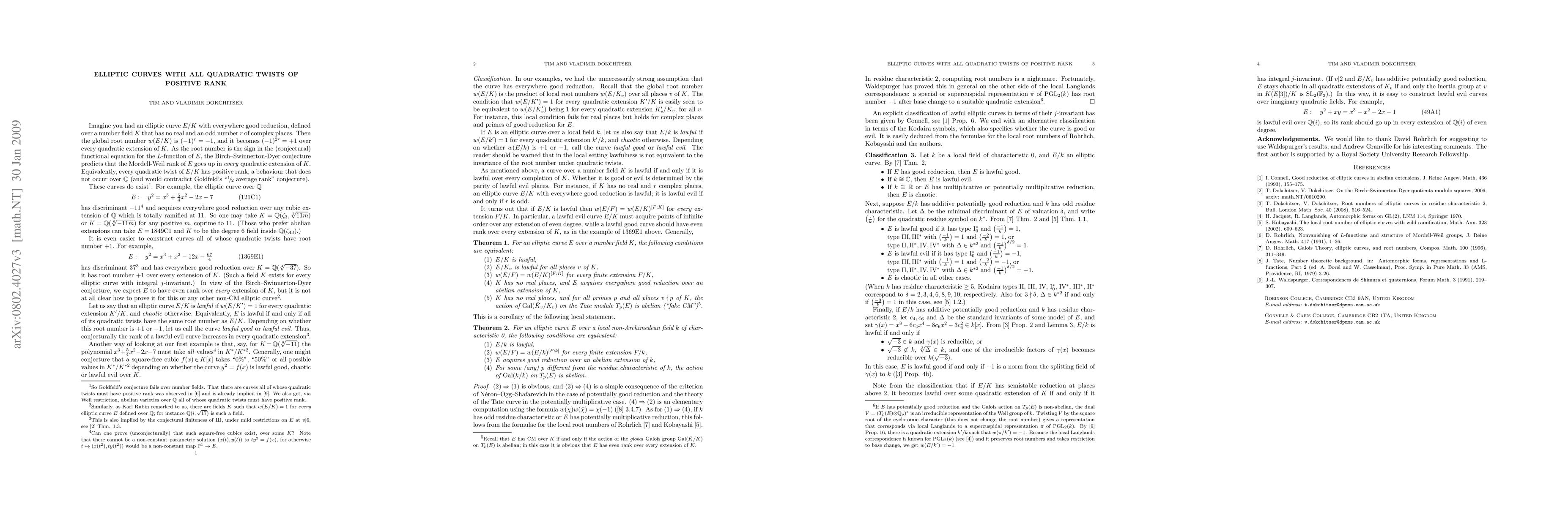 This paper classifies elliptic curves over number fields where all quadratic twists have positive rank, assuming the Birch-Swinnerton-Dyer conjecture. It demonstrates that Goldfeld's conjecture does not apply to these curves, highlighting their unique local behavior and Galois action on the Tate module.