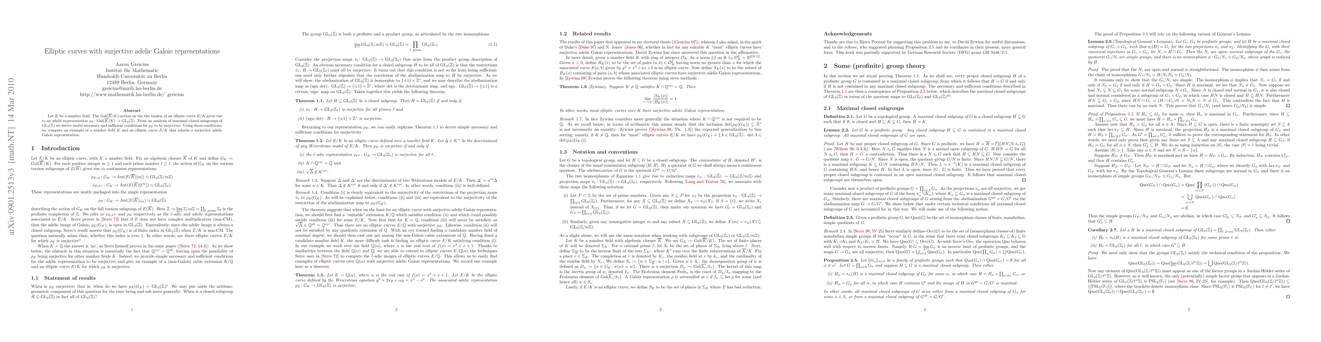 This paper establishes necessary and sufficient conditions for an elliptic curve over a number field to have a surjective adelic Galois representation. It then provides an example of a number field and an elliptic curve meeting these conditions, demonstrating the application of the established criteria.