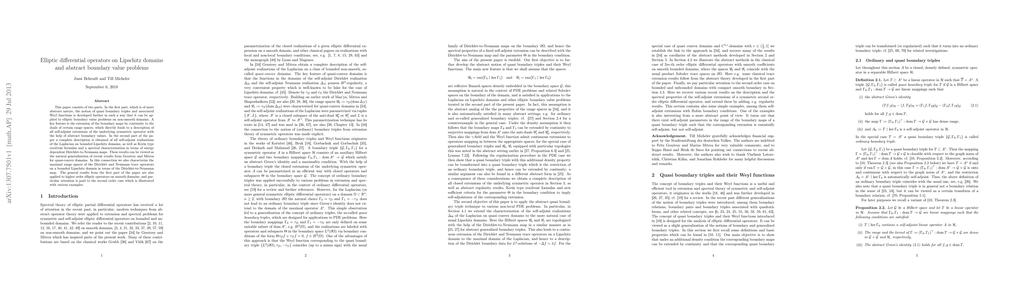This paper develops abstract boundary triples and Weyl functions for elliptic differential operators on non-smooth Lipschitz domains, leading to a description of self-adjoint extensions and spectral characterizations. It also generalizes results for the Laplacian on such domains and characterizes trace operators in terms of the Dirichlet-to-Neumann map.