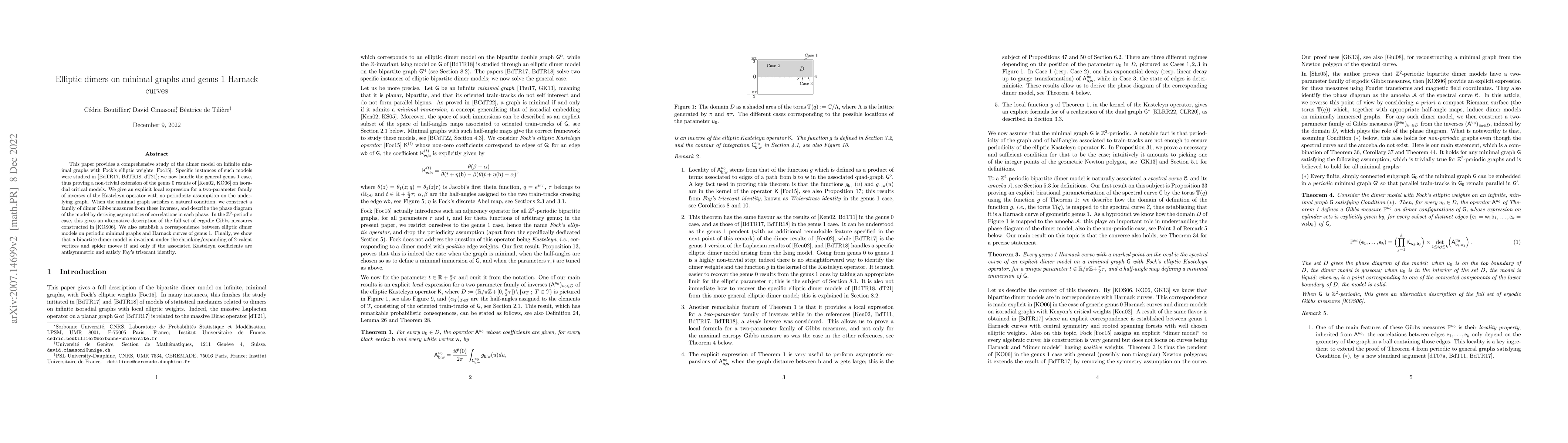 This paper provides a comprehensive study of the dimer model on infinite minimal graphs with Fock's elliptic weights [arXiv:1503.00289]. Specific instances of such models were studied in [arXiv:052711, arXiv:1612.09082, arXiv1801.00207]; we now handle the general genus 1 case, thus proving a non-trivial extension of the genus 0 results of [arXiv:math-ph/0202018, arXiv:math/0311062] on isoradial critical models. We give an explicit local expression for a two-parameter family of inverses of the Kasteleyn operator with no periodicity assumption on the underlying graph. When the minimal graph satisfies a natural condition, we construct a family of dimer Gibbs measures from these inverses, and describe the phase diagram of the model by deriving asymptotics of correlations in each phase. In the $\mathbb{Z}^2$-periodic case, this gives an alternative description of the full set of ergodic Gibbs measures constructed in [arXiv:math-ph/0311005] by Kenyon, Okounkov and Sheffield. We also establish a correspondence between elliptic dimer models on periodic minimal graphs and Harnack curves of genus 1. Finally, we show that a bipartite dimer model is invariant under the shrinking/expanding of 2-valent vertices and spider moves if and only if the associated Kasteleyn coefficients are antisymmetric and satisfy Fay's trisecant identity.