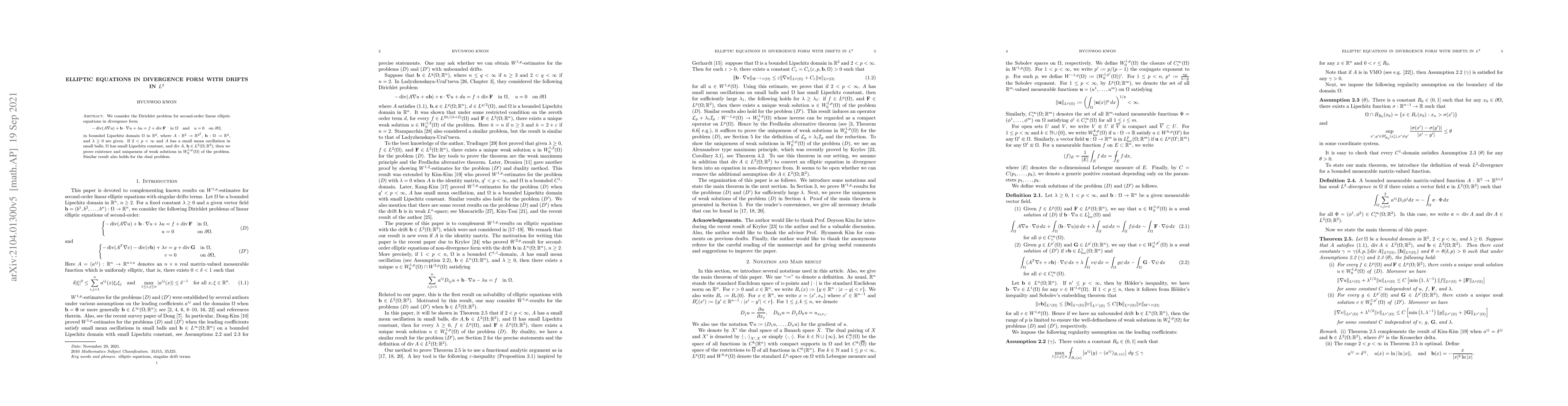 We consider the Dirichlet problem for second-order linear elliptic equations in divergence form \begin{equation*} -\mathrm{div }(A\nabla u)+\mathbf{b} \cdot \nabla u+\lambda u=f+\mathrm{div } \mathbf{F}\quad \text{in } \Omega\quad\text{and}\quad u=0\quad \text{on } \partial\Omega, \end{equation*} in bounded Lipschitz domain $\Omega$ in $\mathbb{R}^2$, where $A:\mathbb{R}^2\rightarrow \mathbb{R}^{2^2}$, $\mathbf{b} : \Omega\rightarrow \mathbb{R}^2$, and $\lambda \geq 0$ are given. If $2