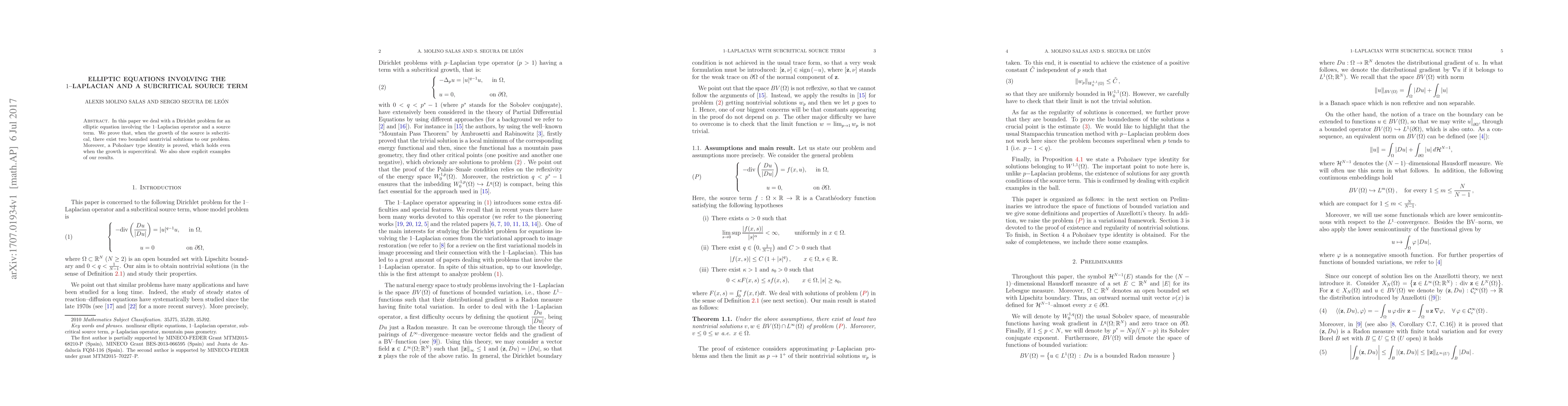 In this paper we deal with a Dirichlet problem for an elliptic equation involving the $1$-Laplacian operator and a source term. We prove that, when the growth of the source is subcritical, there exist two bounded nontrivial solutions to our problem. Moreover, a Pohozaev type identity is proved, which holds even when the growth is supercritical. We also show explicit examples of our results.