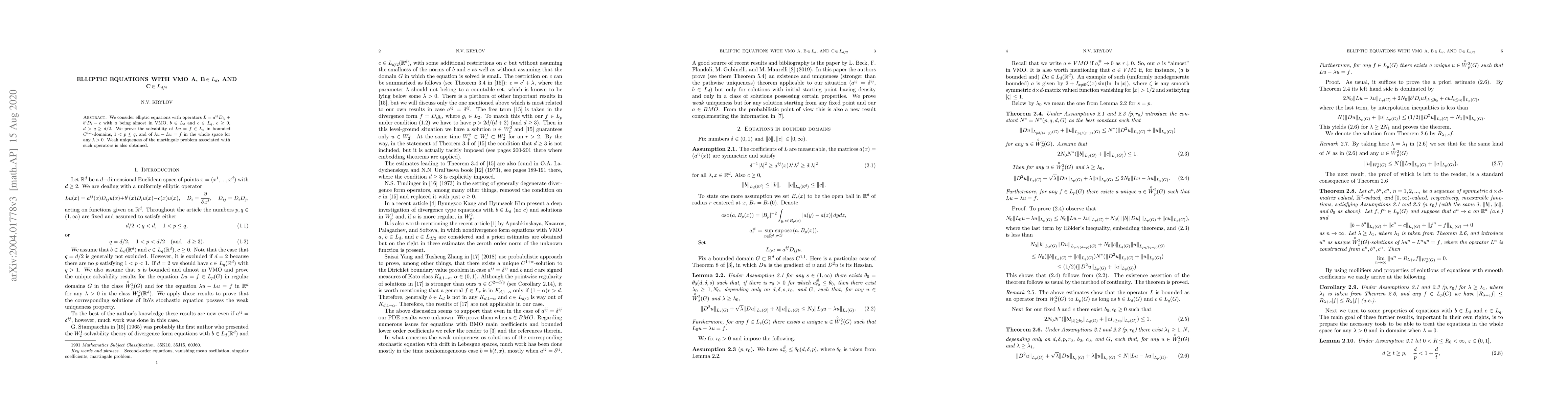 We consider elliptic equations with operators $L=a^{ij}D_{ij}+b^{i}D_{i}-c$ with $a$ being almost in VMO, $b\in L_{d}$ and $c\in L_{q}$, $c\geq0$, $d>q\geq d/2$. We prove the solvability of $Lu=f\in L_{p}$ in bounded $C^{1,1}$-domains, $1