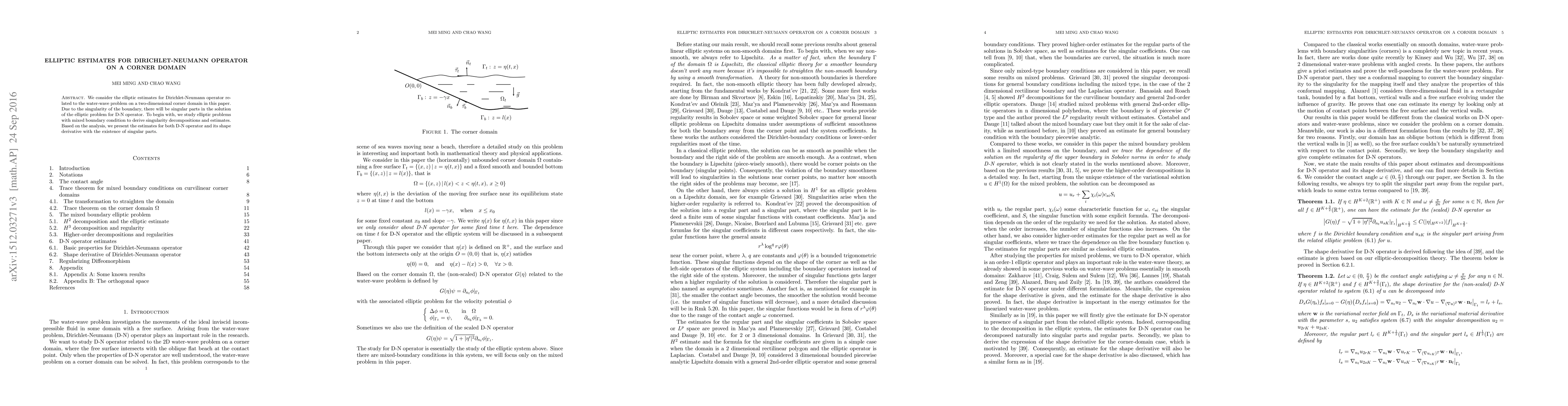 This paper investigates elliptic estimates for the Dirichlet-Neumann operator on a two-dimensional corner domain, focusing on the water-wave problem. It derives singularity decompositions and estimates for mixed boundary conditions, presenting results for both the D-N operator and its shape derivative.
