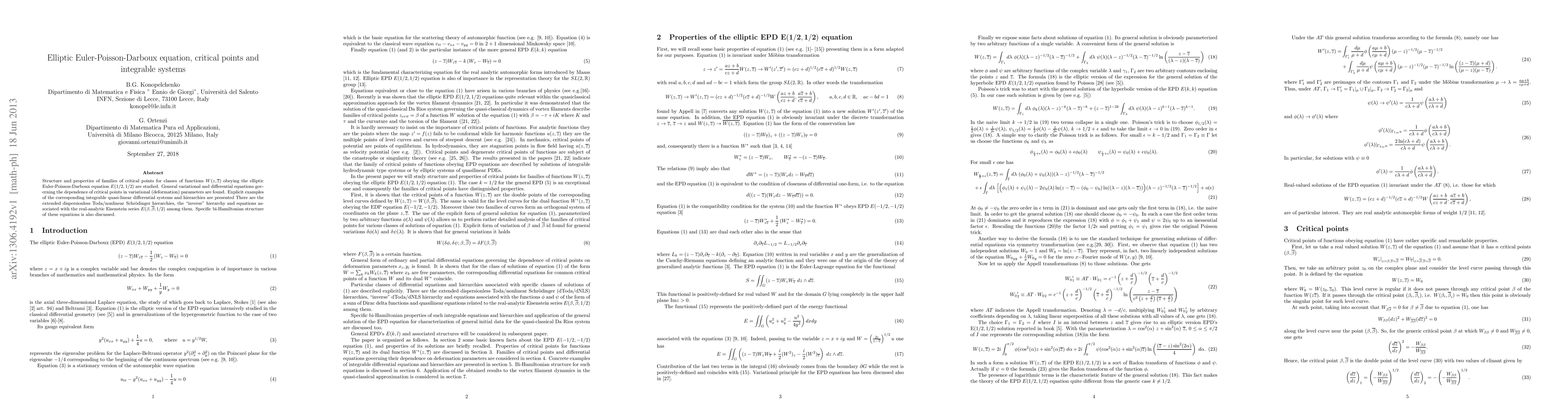 Structure and properties of families of critical points for classes of functions $W(z,\bar{z})$ obeying the elliptic Euler-Poisson-Darboux equation $E(1/2,1/2)$ are studied. General variational and differential equations governing the dependence of critical points in variational (deformation) parameters are found. Explicit examples of the corresponding integrable quasi-linear differential systems and hierarchies are presented There are the extended dispersionless Toda/nonlinear Schr\"{o}dinger hierarchies, the "inverse" hierarchy and equations associated with the real-analytic Eisenstein series $E(\beta,\bar{{\beta}};1/2)$among them. Specific bi-Hamiltonian structure of these equations is also discussed.