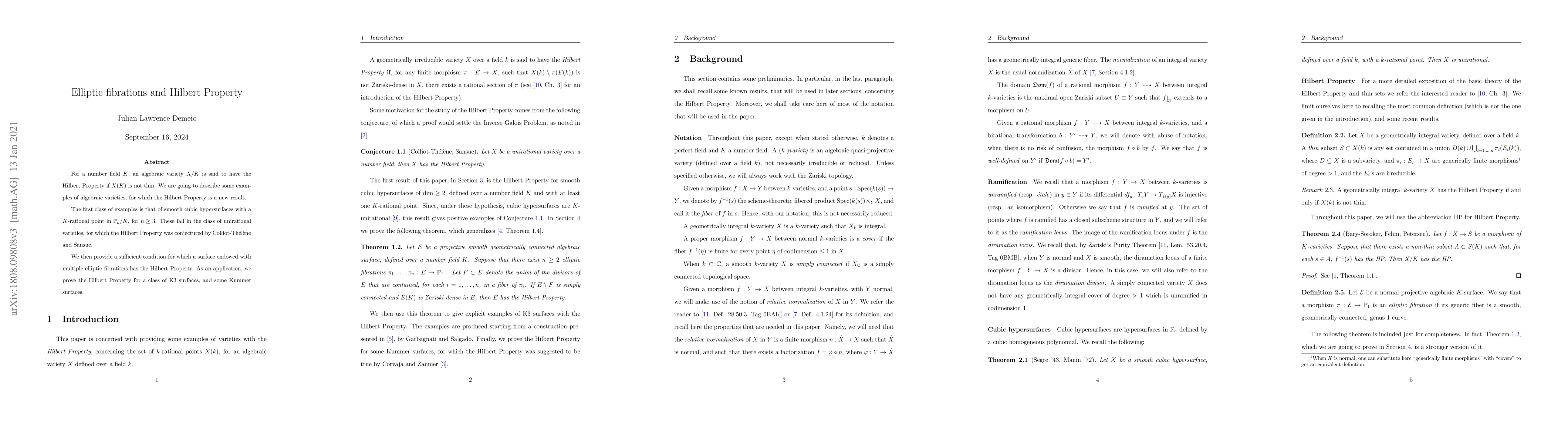 Summary: This paper explores the Hilbert Property in algebraic varieties, demonstrating it for smooth cubic hypersurfaces and providing a condition for surfaces with multiple elliptic fibrations. It confirms the Hilbert Property for certain K3 surfaces and Kummer surfaces.