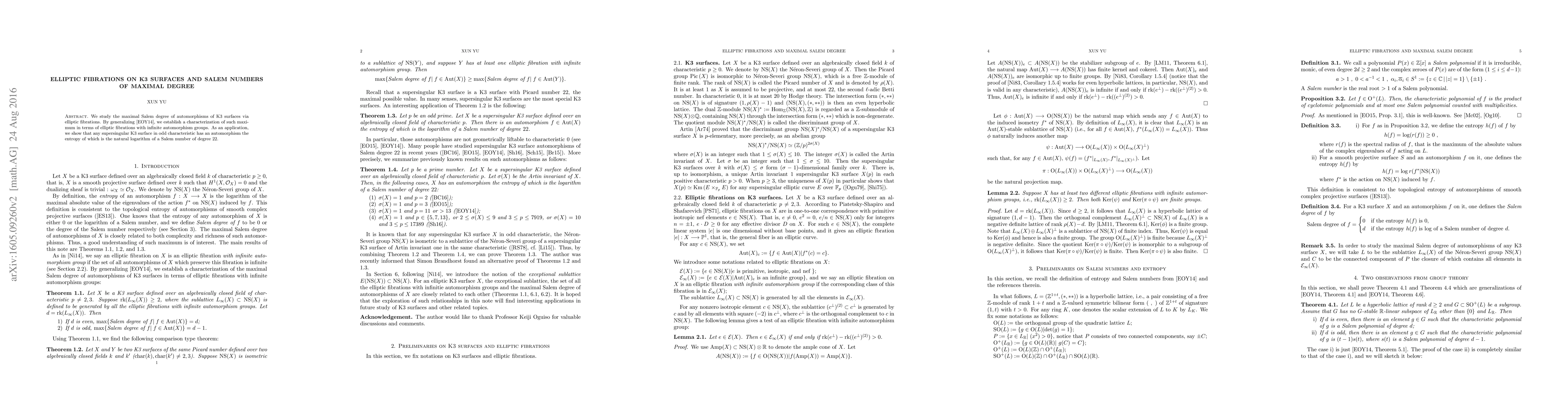 Summary: The paper investigates the maximal Salem degree of K3 surface automorphisms through elliptic fibrations, proving a characterization linked to fibrations with infinite automorphism groups, and demonstrating that supersingular K3 surfaces in odd characteristic have automorphisms with entropy corresponding to a Salem number of degree 22.