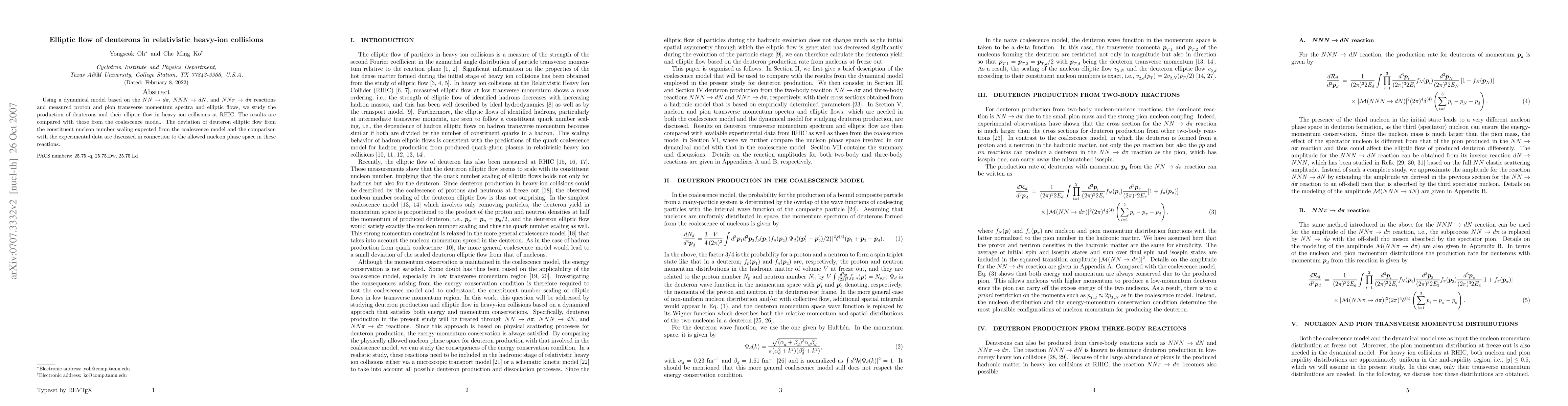 Using a dynamical model based on the $NN \to d\pi$, $NNN \to dN$, and $NN\pi \to d\pi$ reactions and measured proton and pion transverse momentum spectra and elliptic flows, we study the production of deuterons and their elliptic flow in heavy ion collisions at RHIC. The results are compared with those from the coalescence model. The deviation of deuteron elliptic flow from the constituent nucleon number scaling expected from the coalescence model and the comparison with the experimental data are discussed in connection to the allowed nucleon phase space in these reactions.