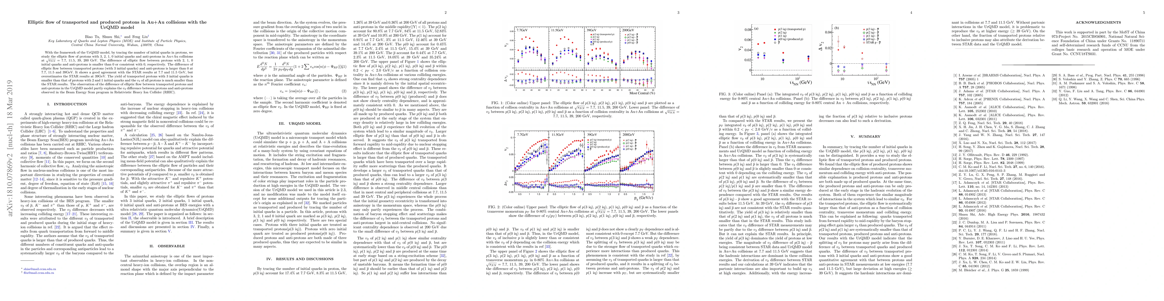 With the framework of UrQMD model, by tracing the number of initial quarks in protons, we study the elliptic flow of transported protons, poduced protons and anti-protons in Au+Au collisions at $\sqrt{s_{NN}}$ = 7.7, 11.5, 39, 200 GeV. The difference of elliptic flow between transported protons and anti-protons is observed. The results of UrQMD model show a good agreement with the STAR results at low energies, but are deviate at high energies. It partly explains the $v_{2}$ difference between proton and anti-proton observed in the Beam Energy Scan program in Relativistic Heavy Ion Collider~(RHIC).