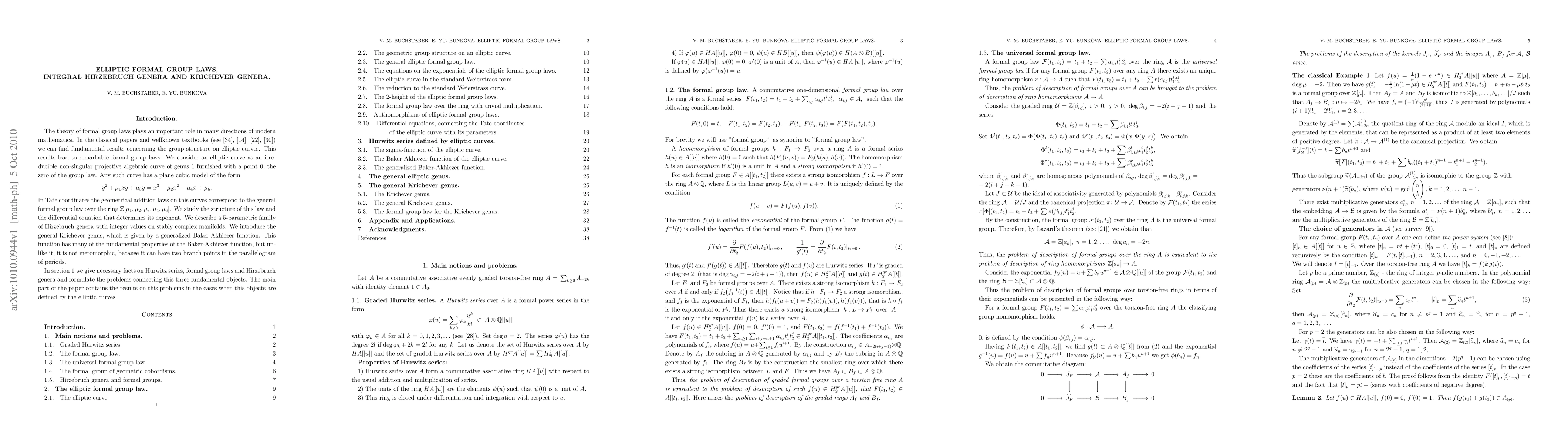 This paper explores the geometric addition law on elliptic curves in Tate coordinates, focusing on the corresponding formal group law over polynomial rings. It introduces a 5-parametric family of Hirzebruch genera with integer values and presents a generalized Krichever genus through a non-meromorphic Baker-Akhiezer function with two branch points.