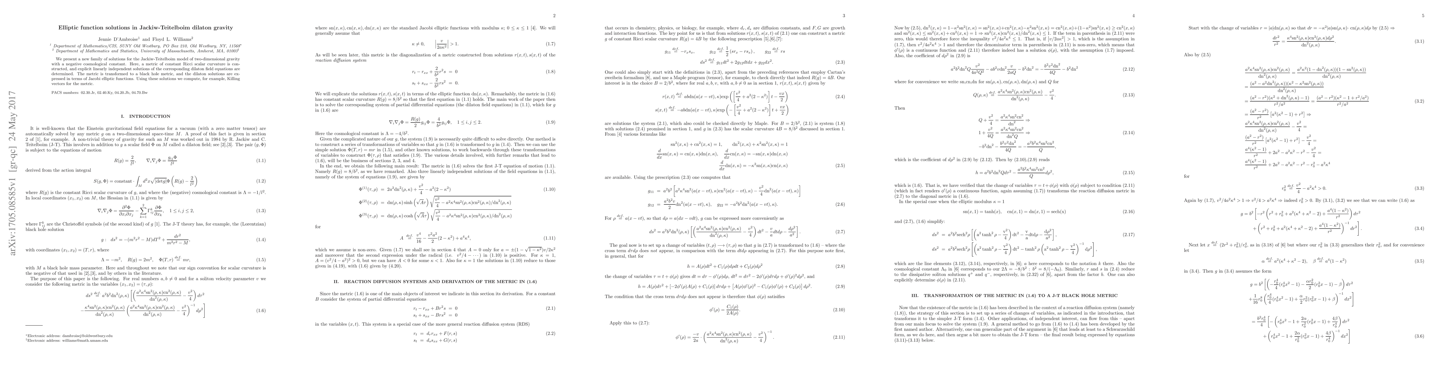 This paper introduces new solutions for the Jackiw-Teitelboim model of two-dimensional gravity, constructing a metric with constant Ricci scalar curvature and deriving dilaton field equations solved using Jacobi elliptic functions. These solutions are then applied to compute Killing vectors for the resulting black hole metric.