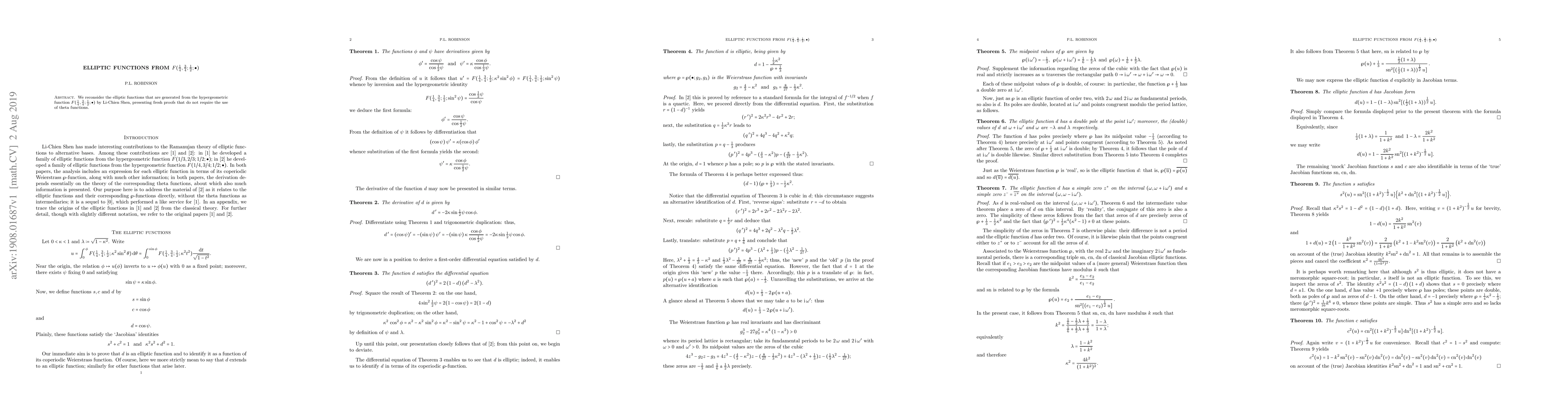 This paper revisits elliptic functions derived from the hypergeometric function $F(\tfrac{1}{4}, \tfrac{3}{4}; \tfrac{1}{2} ; \bullet)$, offering new proofs that avoid the use of theta functions, as originally developed by Li-Chien Shen.