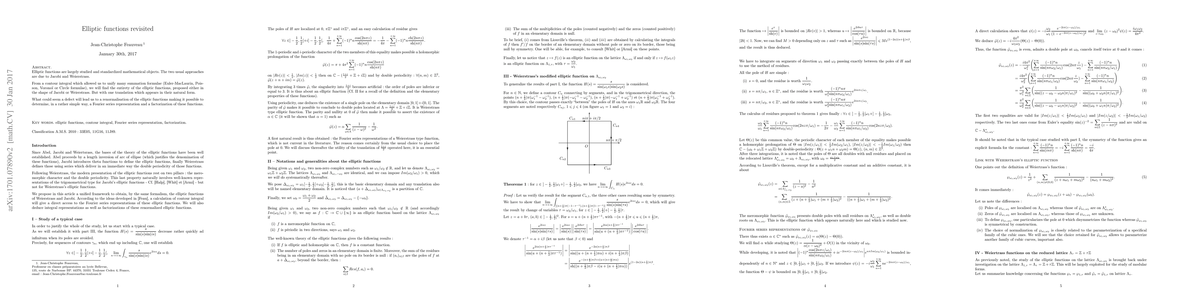 This paper revisits elliptic functions using a contour integral approach to unify various summation formulae, leading to a renormalized form of elliptic functions. This renormalisation simplifies the determination of their Fourier series representation and factorization.