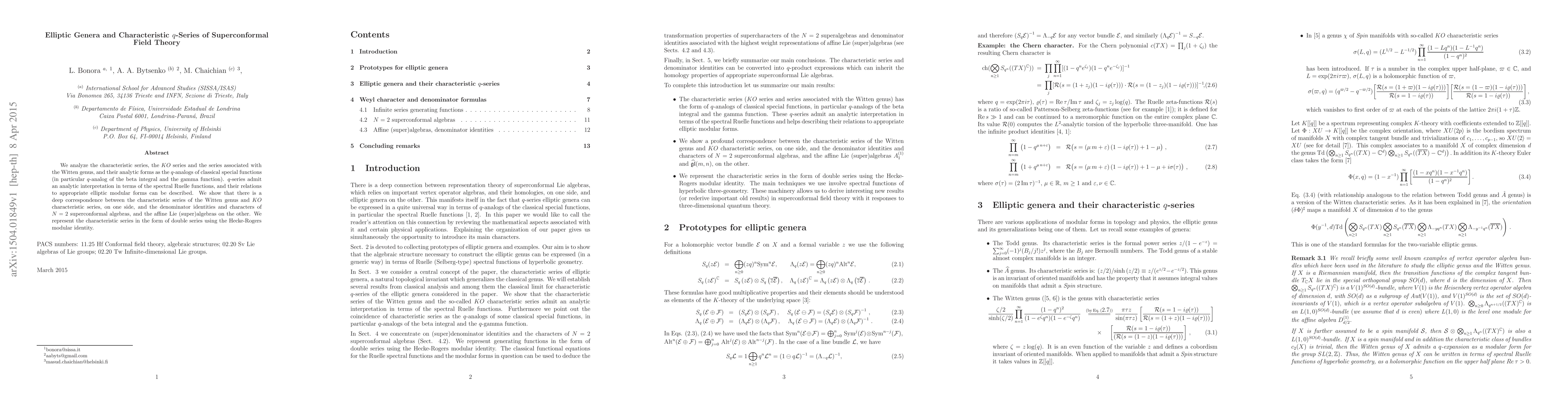 We analyze the characteristic series, the $KO$ series and the series associated with the Witten genus, and their analytic forms as the $q$-analogs of classical special functions (in particular $q$-analog of the beta integral and the gamma function). $q$-series admit an analytic interpretation in terms of the spectral Ruelle functions, and their relations to appropriate elliptic modular forms can be described. We show that there is a deep correspondence between the characteristic series of the Witten genus and $KO$ characteristic series, on one side, and the denominator identities and characters of $N=2$ superconformal algebras, and the affine Lie (super)algebras on the other. We represent the characteristic series in the form of double series using the Hecke-Rogers modular identity.