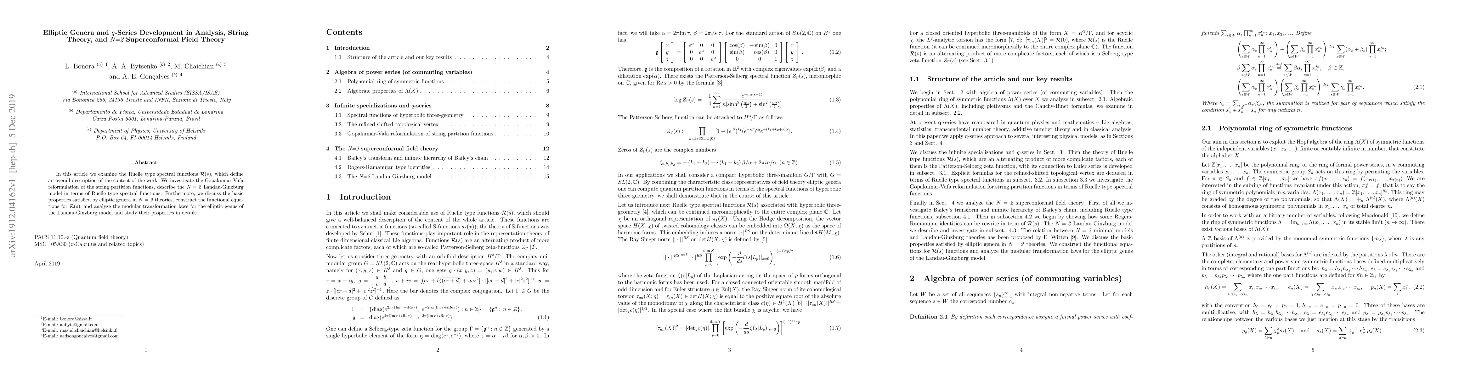 This paper explores Ruelle type spectral functions $\cR(s)$ in the context of string theory and N=2 superconformal field theory, focusing on the Gopakumar-Vafa reformulation of string partition functions and the N=2 Landau-Ginzburg model. It investigates elliptic genera properties and constructs functional equations for $\cR(s)$, analyzing modular transformation laws for the Landau-Ginzburg model's elliptic genus.