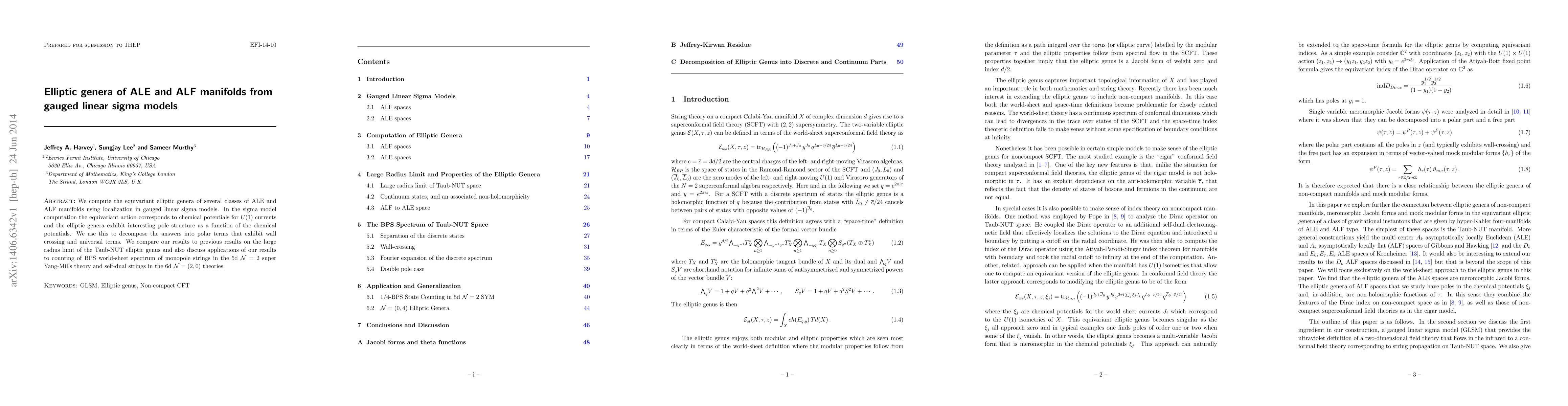 This paper computes the equivariant elliptic genera of ALE and ALF manifolds using gauged linear sigma models, revealing a pole structure and decomposing results into wall crossing and universal terms. It also connects these findings to BPS spectrum counts in higher-dimensional super Yang-Mills theories.