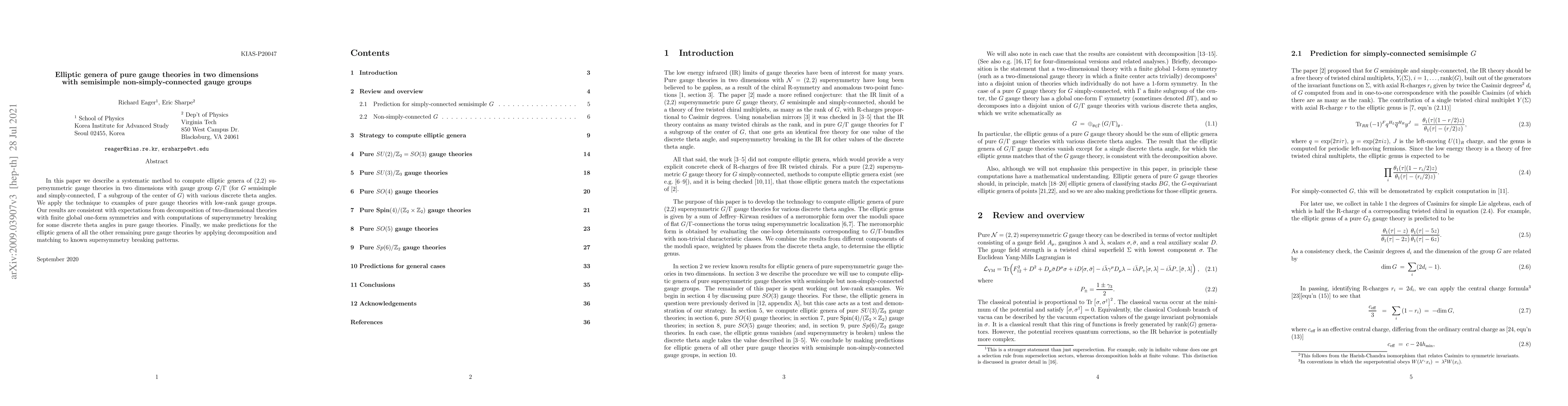 In this paper we describe a systematic method to compute elliptic genera of (2,2) supersymmetric gauge theories in two dimensions with gauge group G/Gamma (for G semisimple and simply-connected, Gamma a subgroup of the center of G) with various discrete theta angles. We apply the technique to examples of pure gauge theories with low-rank gauge groups. Our results are consistent with expectations from decomposition of two-dimensional theories with finite global one-form symmetries and with computations of supersymmetry breaking for some discrete theta angles in pure gauge theories. Finally, we make predictions for the elliptic genera of all the other remaining pure gauge theories by applying decomposition and matching to known supersymmetry breaking patterns.