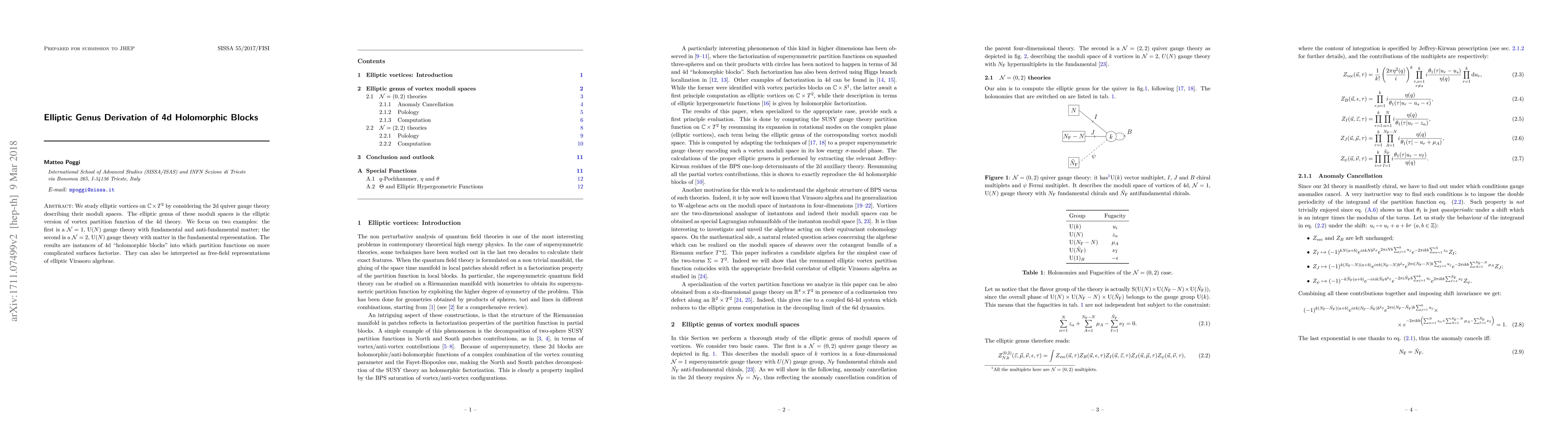 We study elliptic vortices on $\mathbb{C}\times T^2$ by considering the 2d quiver gauge theory describing their moduli spaces. The elliptic genus of these moduli spaces is the elliptic version of vortex partition function of the 4d theory. We focus on two examples: the first is a $\mathcal{N}=1$, $\mathrm{U}(N)$ gauge theory with fundamental and anti-fundamental matter; the second is a $\mathcal{N}=2$, $\mathrm{U}(N)$ gauge theory with matter in the fundamental representation. The results are instances of 4d "holomorphic blocks" into which partition functions on more complicated surfaces factorize. They can also be interpreted as free-field representations of elliptic Virasoro algebrae.