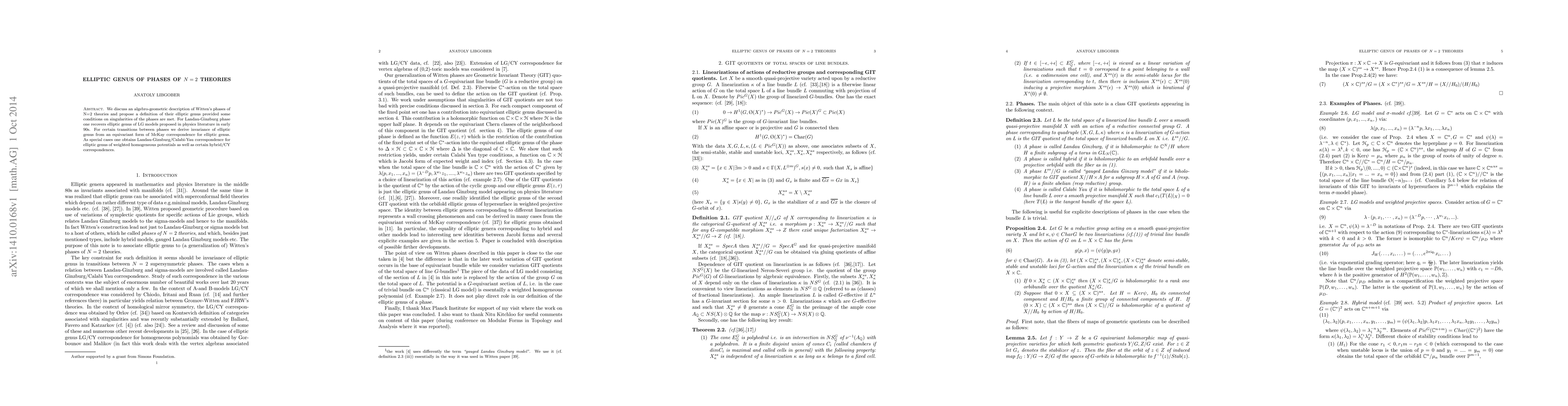 This paper proposes an algebro-geometric definition of the elliptic genus for Witten's phases of N=2 theories under specific singularity conditions. It recovers the elliptic genus of Landau-Ginzburg models and derives invariance through an equivariant form of the McKay correspondence.