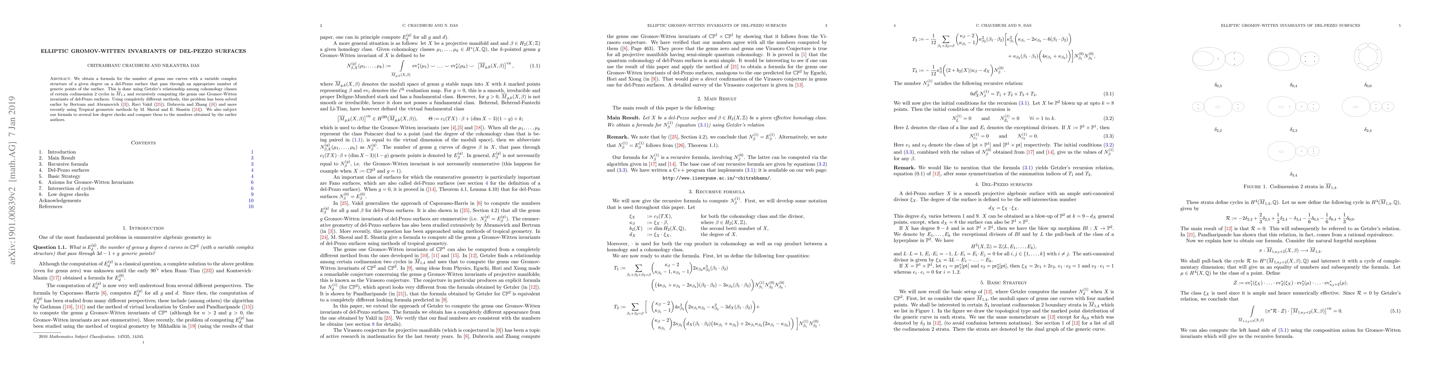 This paper derives a formula for the number of genus one curves on del-Pezzo surfaces passing through specified points, leveraging Getzler's cohomological relationship and recursive computation of genus-one Gromov-Witten invariants. It validates the new formula through low-degree checks and comparisons with previous results by Bertram, Abramovich, Ravi Vakil, Dubrovin, Zhang, and Shoval/Shustin.