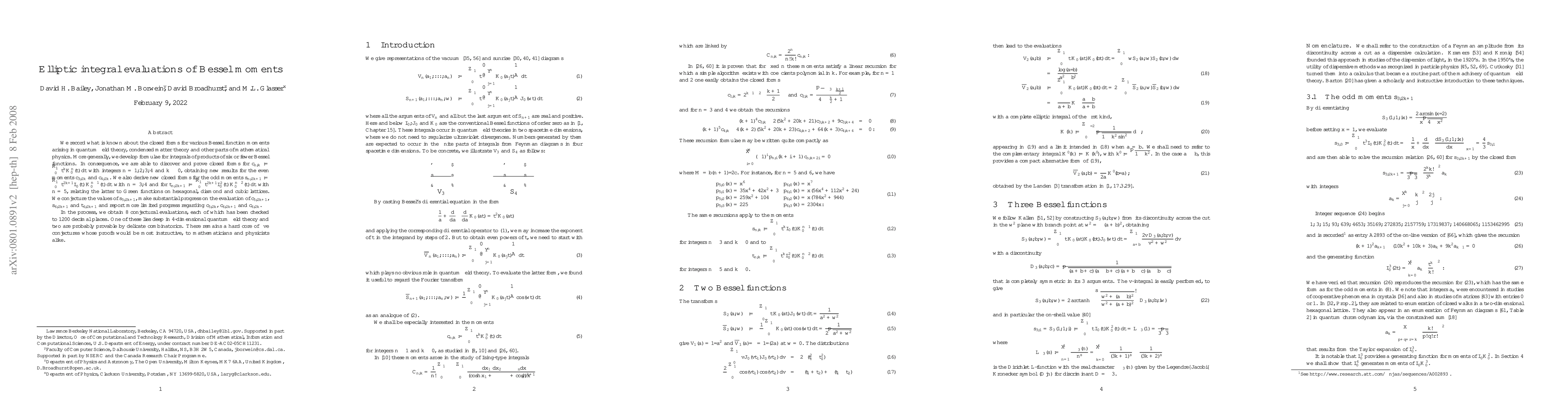 We record what is known about the closed forms for various Bessel function moments arising in quantum field theory, condensed matter theory and other parts of mathematical physics. More generally, we develop formulae for integrals of products of six or fewer Bessel functions. In consequence, we are able to discover and prove closed forms for $c_{n,k}:=\int_0^\infty t^k K_0^n(t) {\rm d}t$ with integers $n=1,2,3,4$ and $k\ge0$, obtaining new results for the even moments $c_{3,2k}$ and $c_{4,2k}$. We also derive new closed forms for the odd moments $s_{n,2k+1}:=\int_0^\infty t^{2k+1}I_0^{}(t) K_0^{n-1}(t) {\rm d}t$ with $n=3,4$ and for $t_{n,2k+1}:=\int_0^\infty t^{2k+1}I_0^2(t) K_0^{n-2}(t) {\rm d}t$ with $n=5$, relating the latter to Green functions on hexagonal, diamond and cubic lattices. We conjecture the values of $s_{5,2k+1}$, make substantial progress on the evaluation of $c_{5,2k+1}$, $s_{6,2k+1}$ and $t_{6,2k+1}$ and report more limited progress regarding $c_{5,2k}$, $c_{6,2k+1}$ and $c_{6,2k}$. In the process, we obtain 8 conjectural evaluations, each of which has been checked to 1200 decimal places. One of these lies deep in 4- dimensional quantum field theory and two are probably provable by delicate combinatorics. There remains a hard core of five conjectures whose proofs would be most instructive, to mathematicians and physicists alike.