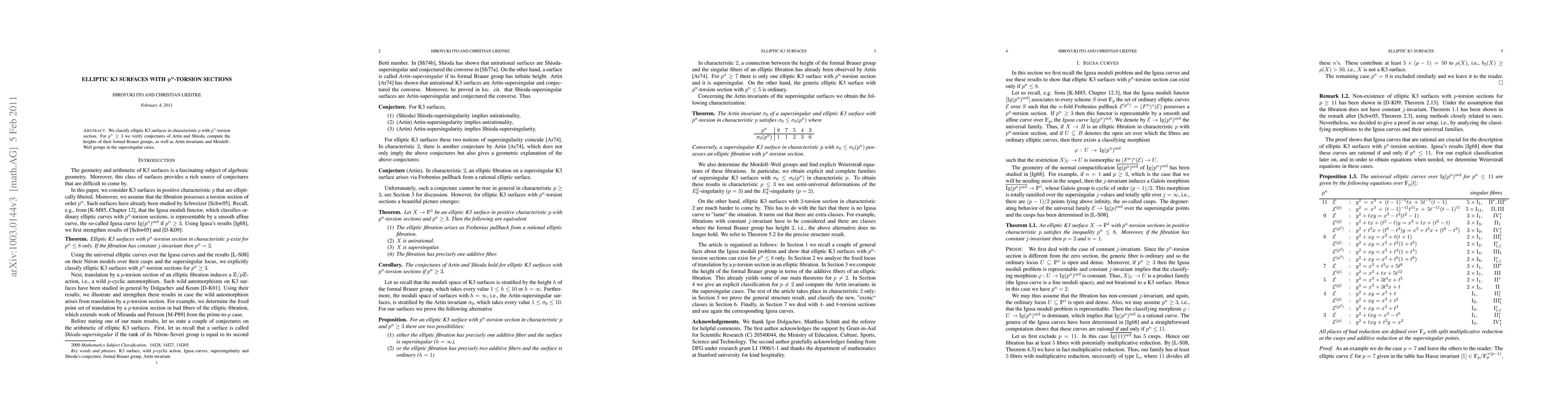 This paper classifies elliptic K3 surfaces in characteristic $p$ that possess $p^n$-torsion sections, verifying conjectures of Artin and Shioda and computing the heights of their formal Brauer groups, Artin invariants, and Mordell-Weil groups for supersingular cases.