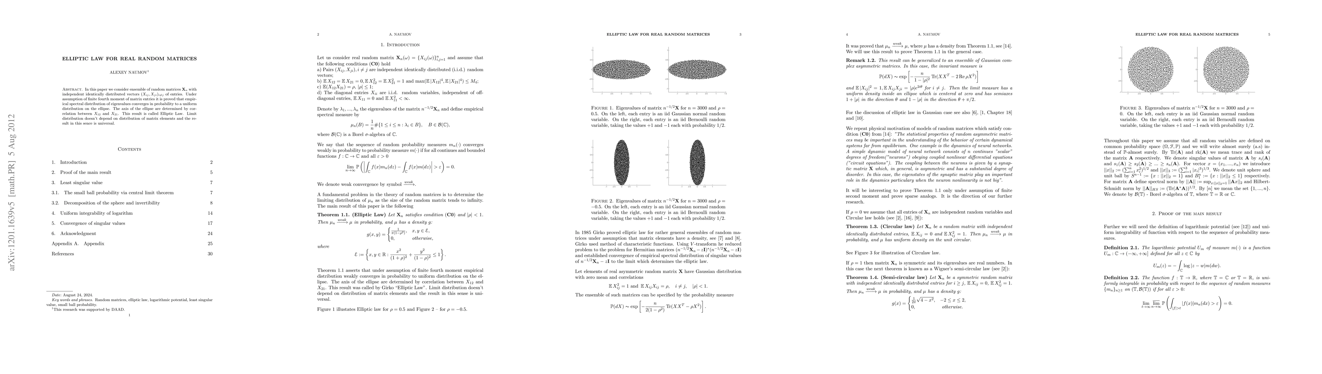 In this paper we consider ensemble of random matrices $\X_n$ with independent identically distributed vectors $(X_{ij}, X_{ji})_{i \neq j}$ of entries. Under assumption of finite fourth moment of matrix entries it is proved that empirical spectral distribution of eigenvalues converges in probability to a uniform distribution on the ellipse. The axis of the ellipse are determined by correlation between $X_{12}$ and $X_{21}$. This result is called Elliptic Law. Limit distribution doesn't depend on distribution of matrix elements and the result in this sence is universal.