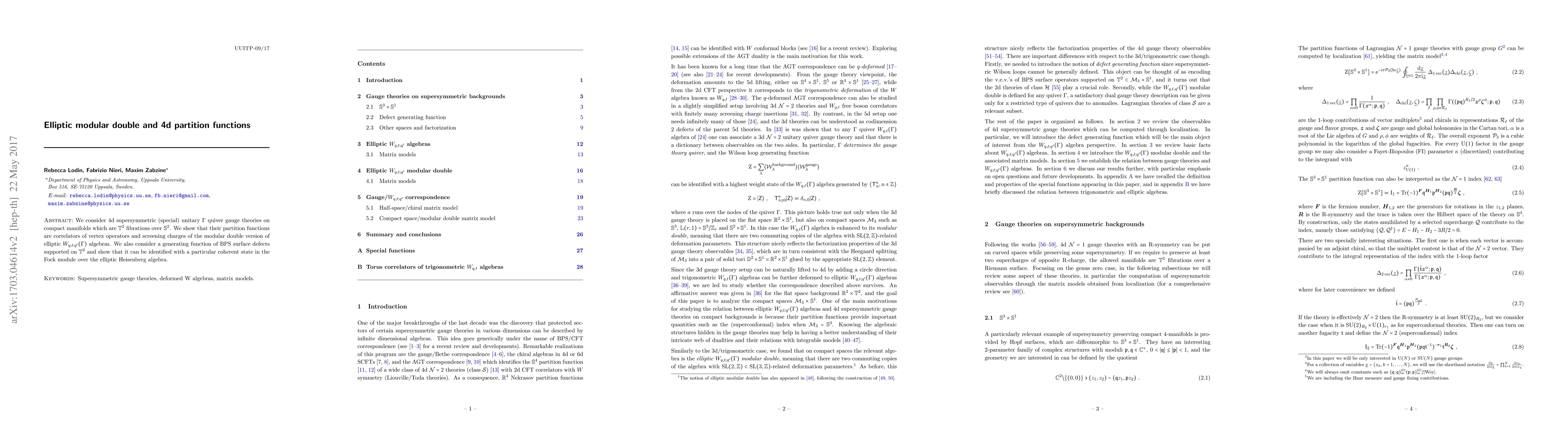 This paper explores 4d supersymmetric gauge theories on $T^2$ fibrations over $S^2$, demonstrating that their partition functions correspond to correlators of elliptic modular double algebras. It also identifies a generating function for BPS surface defects with a coherent state in the elliptic Heisenberg algebra.
