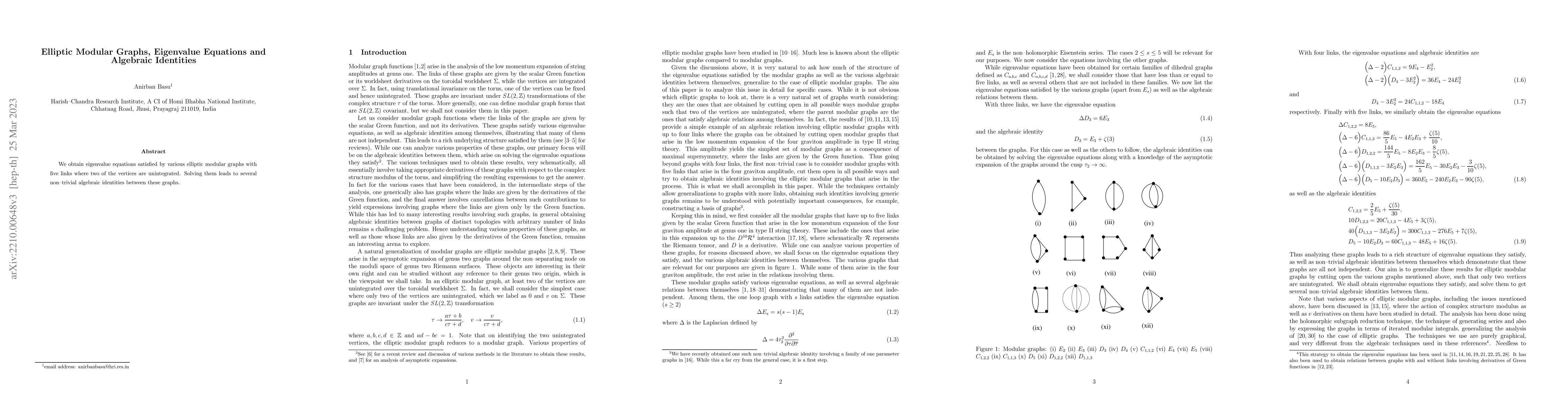 We obtain eigenvalue equations satisfied by various elliptic modular graphs with five links where two of the vertices are unintegrated. Solving them leads to several non--trivial algebraic identities between these graphs.