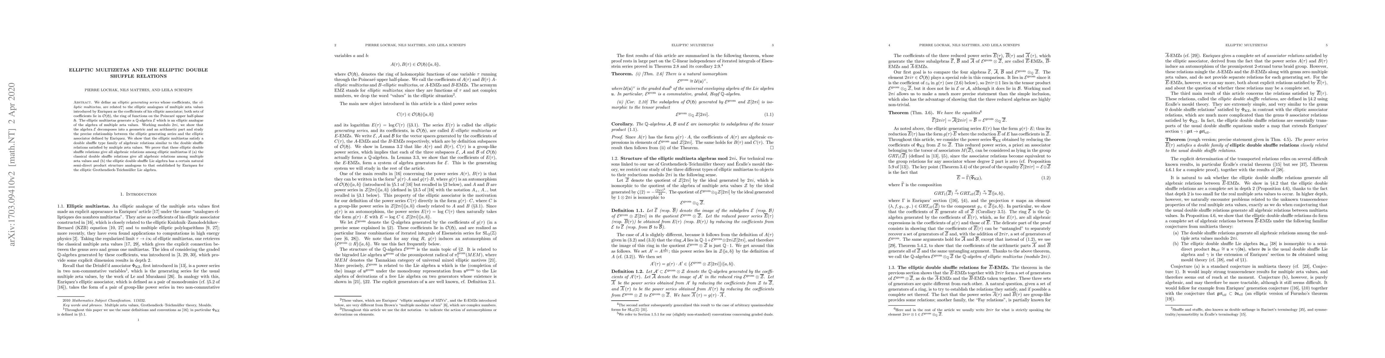 We define an elliptic generating series whose coefficients, the elliptic multizetas, are related to the elliptic analogues of multiple zeta values introduced by Enriquez as the coefficients of his elliptic associator; both sets of coefficients lie in $\mathcal{O}(\mathfrak{H})$, the ring of functions on the Poincar\'e upper half-plane $\mathfrak H$. The elliptic multizetas generate a $\mathbb Q$-algebra $\mathcal{E}$ which is an elliptic analogue of the algebra of multiple zeta values. Working modulo $2\pi i$, we show that the algebra $\mathcal{E}$ decomposes into a geometric and an arithmetic part and study the precise relationship between the elliptic generating series and the elliptic associator defined by Enriquez. We show that the elliptic multizetas satisfy a double shuffle type family of algebraic relations similar to the double shuffle relations satisfied by multiple zeta values. We prove that these elliptic double shuffle relations give all algebraic relations among elliptic multizetas if (a) the classical double shuffle relations give all algebraic relations among multiple zeta values and (b) the elliptic double shuffle Lie algebra has a certain natural semi-direct product structure analogous to that established by Enriquez for the elliptic Grothendieck-Teichm\"uller Lie algebra.