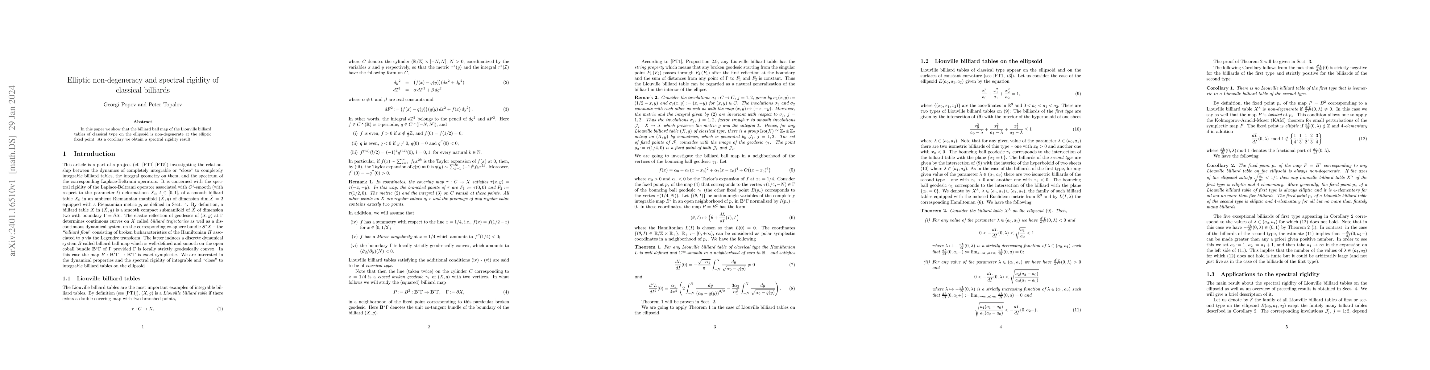 Summary: The paper demonstrates the elliptic non-degeneracy of the billiard ball map on ellipsoidal Liouville billiard tables, establishing spectral rigidity as a corollary.