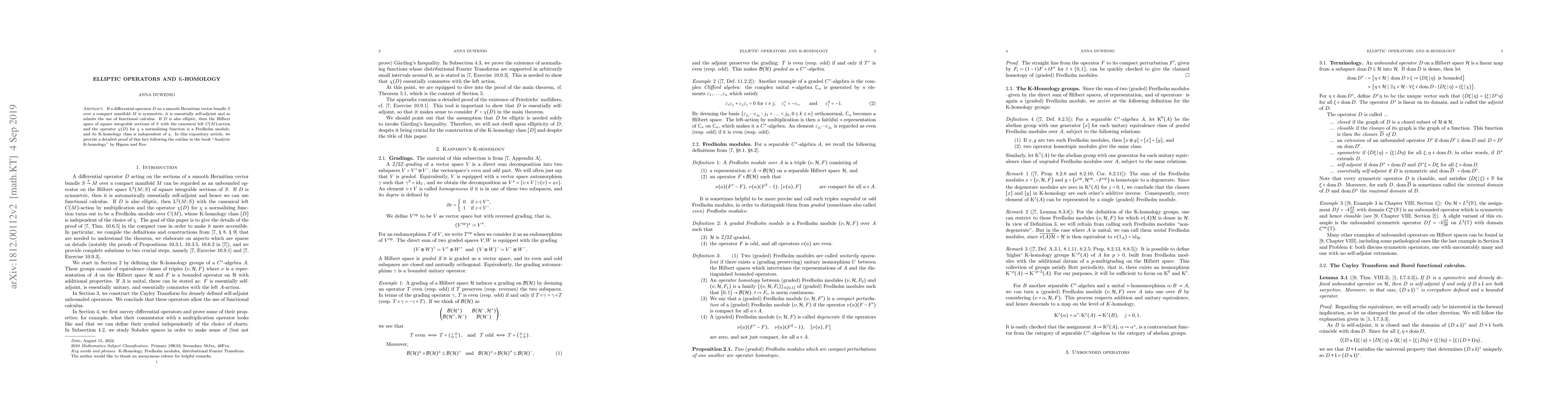 If a differential operator $D$ on a smooth Hermitian vector bundle $S$ over a compact manifold $M$ is symmetric, it is essentially self-adjoint and so admits the use of functional calculus. If $D$ is also elliptic, then the Hilbert space of square integrable sections of $S$ with the canonical left $C(M)$-action and the operator $\chi(D)$ for $\chi$ a normalizing function is a Fredholm module, and its $K$-homology class is independent of $\chi$. In this expository article, we provide a detailed proof of this fact following the outline in the book "Analytic K-homology" by Higson and Roe.