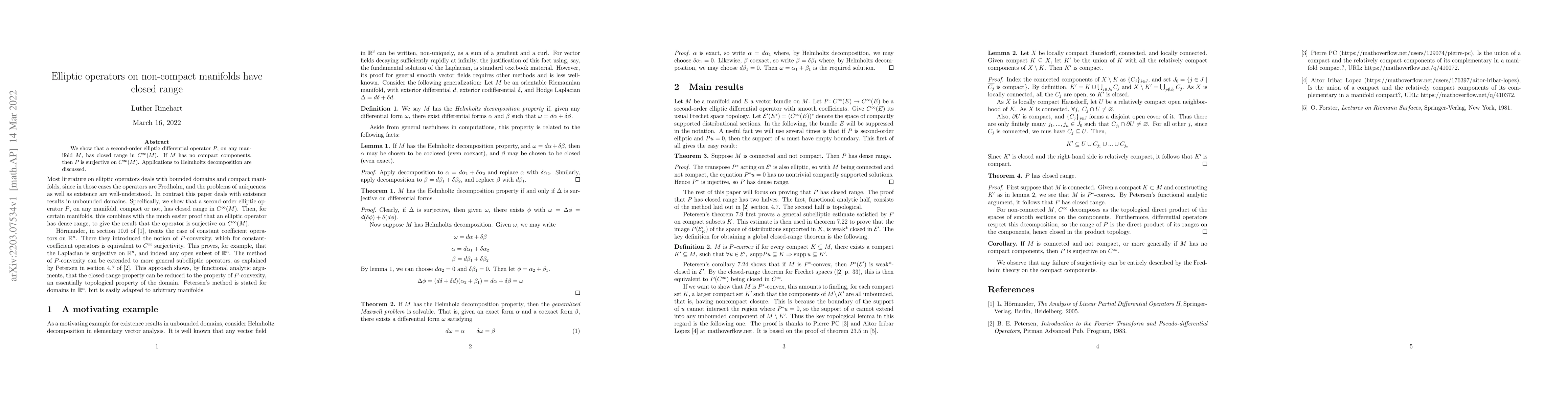A second-order elliptic differential operator on a non-compact manifold has a closed range, meaning it maps bounded sets to bounded sets. This result has implications for Helmholtz decomposition applications.
