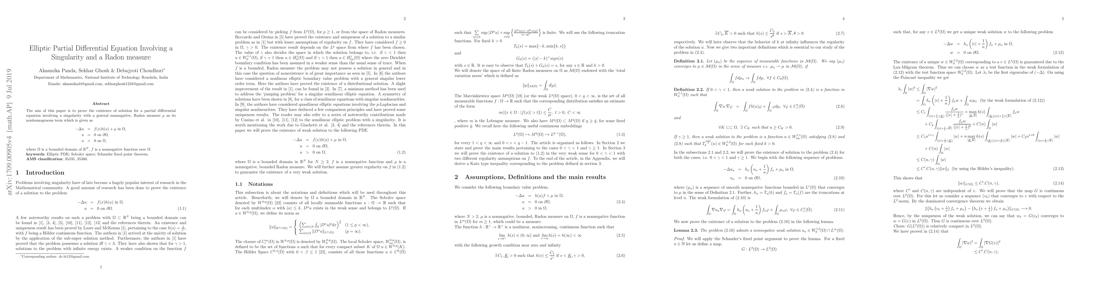 The aim of this paper is to prove the existence of solution for a partial differential equation involving a singularity with a general nonnegative, Radon measure $\mu$ as its nonhomogenous term which is given as \begin{eqnarray} -\Delta u&=& f(x)h(u)+\mu~\text{in}~\Omega,\nonumber u&=&0~\text{on}~\partial\Omega,\nonumber u&>& 0~\text{on}~\Omega\nonumber, \end{eqnarray} where $\Omega$ is a bounded domain of $\mathbb{R}^N$, $f$ is a nonnegative function over $\Omega$.