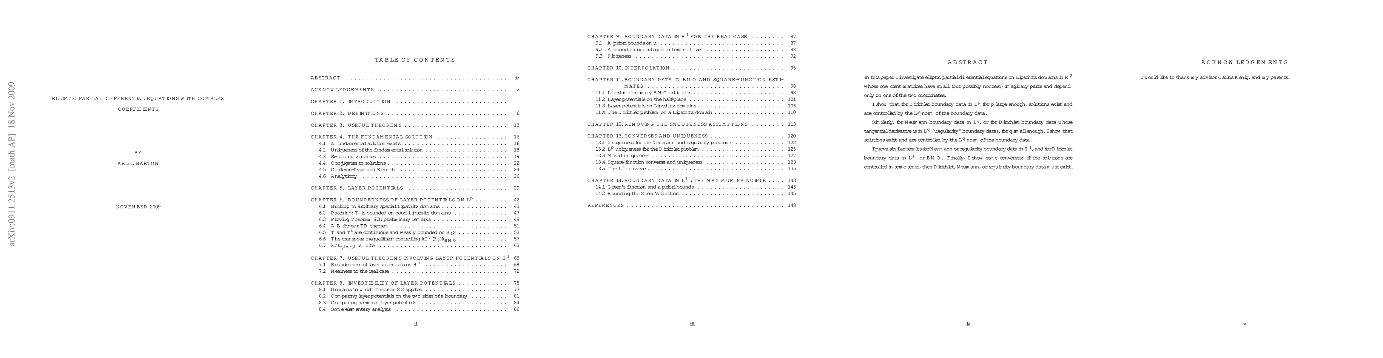 This paper investigates elliptic partial differential equations with complex coefficients on Lipschitz domains in the plane, showing that solutions exist for certain boundary data conditions and are controlled by the L^p- or L^q-norm of the boundary data.