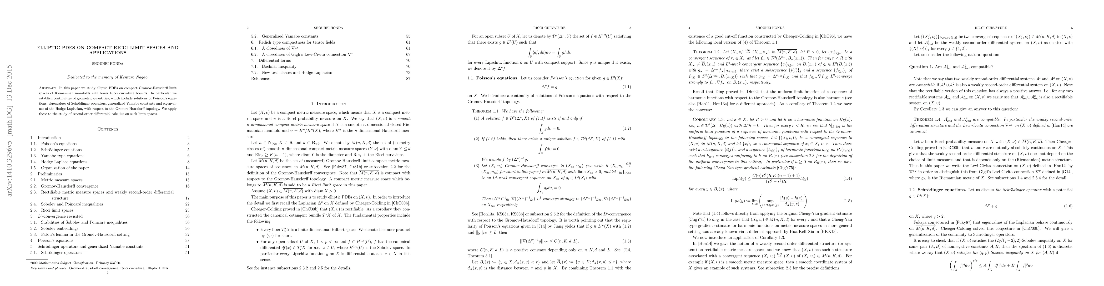 This paper investigates elliptic partial differential equations (PDEs) on compact Ricci limit spaces, establishing continuity of geometric quantities like solutions to Poisson's equations and eigenvalues of Schrödinger operators under Gromov-Hausdorff convergence. Applications include second-order differential calculus on these limit spaces.